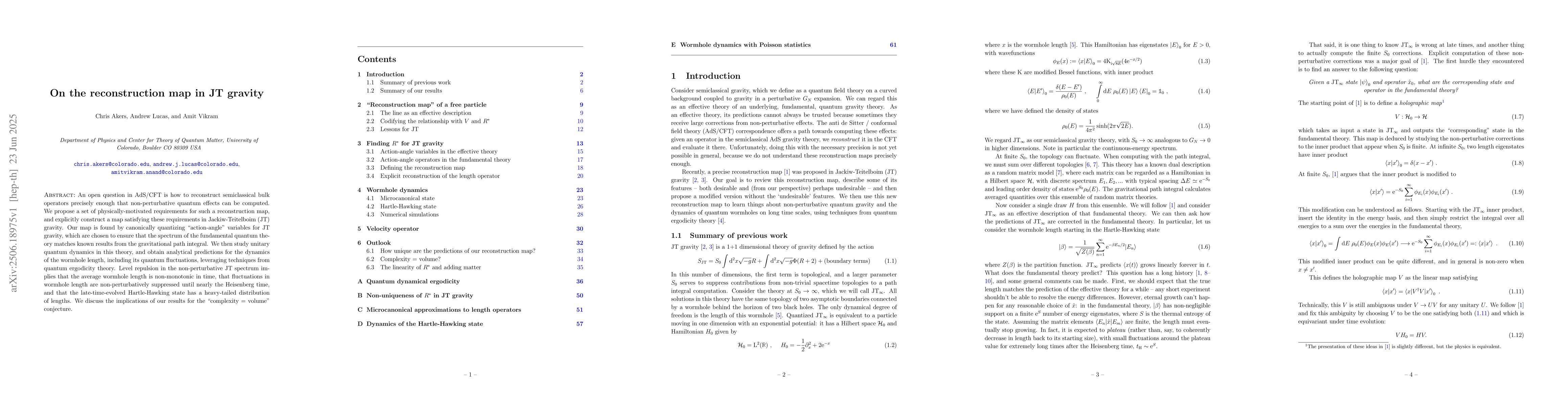An open question in AdS/CFT is how to reconstruct semiclassical bulk operators precisely enough that non-perturbative quantum effects can be computed. We propose a set of physically-motivated requirements for such a reconstruction map, and explicitly construct a map satisfying these requirements in Jackiw-Teitelboim (JT) gravity. Our map is found by canonically quantizing "action-angle" variables for JT gravity, which are chosen to ensure that the spectrum of the fundamental quantum theory matches known results from the gravitational path integral. We then study unitary quantum dynamics in this theory, and obtain analytical predictions for the dynamics of the wormhole length, including its quantum fluctuations, leveraging techniques from quantum ergodicity theory. Level repulsion in the non-perturbative JT spectrum implies that the average wormhole length is non-monotonic in time, that fluctuations in wormhole length are non-perturbatively suppressed until nearly the Heisenberg time, and that the late-time-evolved Hartle-Hawking state has a heavy-tailed distribution of lengths. We discuss the implications of our results for the "complexity = volume" conjecture.
