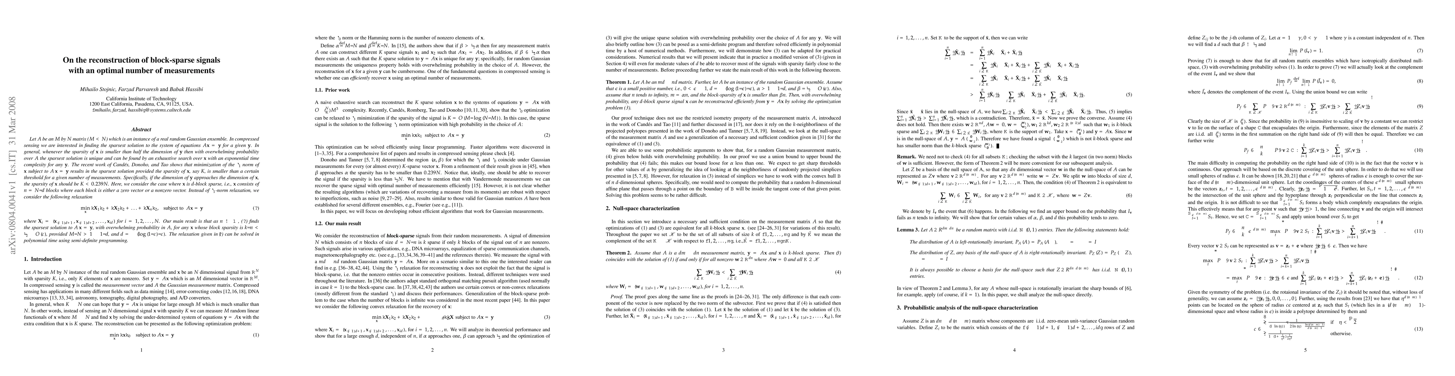 Let A be an M by N matrix (M < N) which is an instance of a real random Gaussian ensemble. In compressed sensing we are interested in finding the sparsest solution to the system of equations A x = y for a given y. In general, whenever the sparsity of x is smaller than half the dimension of y then with overwhelming probability over A the sparsest solution is unique and can be found by an exhaustive search over x with an exponential time complexity for any y. The recent work of Cand\'es, Donoho, and Tao shows that minimization of the L_1 norm of x subject to A x = y results in the sparsest solution provided the sparsity of x, say K, is smaller than a certain threshold for a given number of measurements. Specifically, if the dimension of y approaches the dimension of x, the sparsity of x should be K < 0.239 N. Here, we consider the case where x is d-block sparse, i.e., x consists of n = N / d blocks where each block is either a zero vector or a nonzero vector. Instead of L_1-norm relaxation, we consider the following relaxation min x \| X_1 \|_2 + \| X_2 \|_2 + ... + \| X_n \|_2, subject to A x = y where X_i = (x_{(i-1)d+1}, x_{(i-1)d+2}, ..., x_{i d}) for i = 1,2, ..., N. Our main result is that as n -> \infty, the minimization finds the sparsest solution to Ax = y, with overwhelming probability in A, for any x whose block sparsity is k/n < 1/2 - O(\epsilon), provided M/N > 1 - 1/d, and d = \Omega(\log(1/\epsilon)/\epsilon). The relaxation can be solved in polynomial time using semi-definite programming.