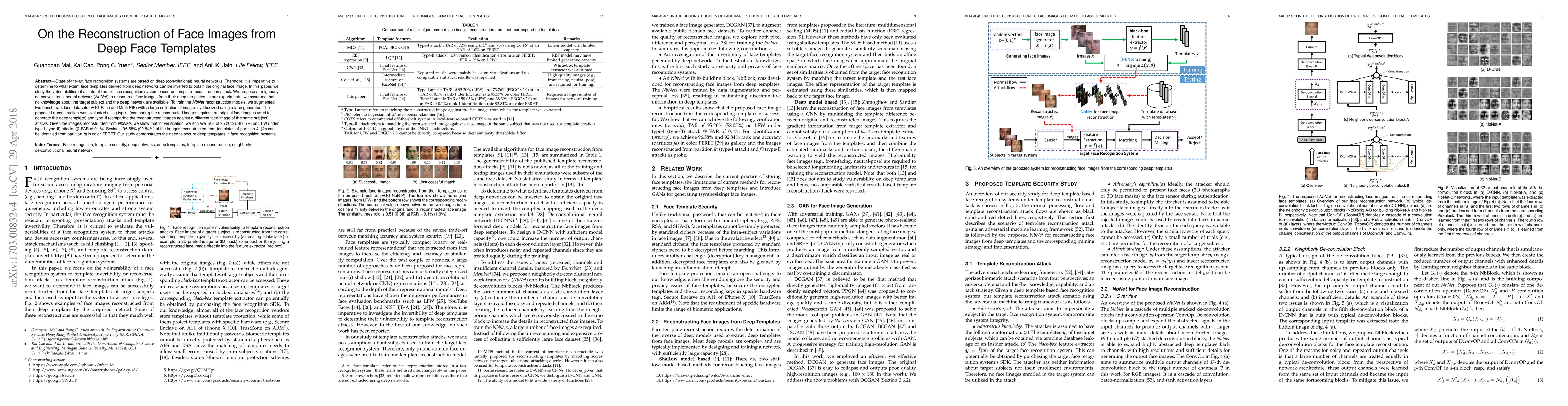 This paper investigates the vulnerability of state-of-the-art face recognition systems by reconstructing face images from deep templates using a proposed neighborly de-convolutional neural network (NbNet). The study shows high reconstruction accuracy, achieving 95.20% true acceptance rate (TAR) under type-I attacks and 58.05% under type-II attacks on LFW, highlighting the need for securing deep templates in face recognition systems.