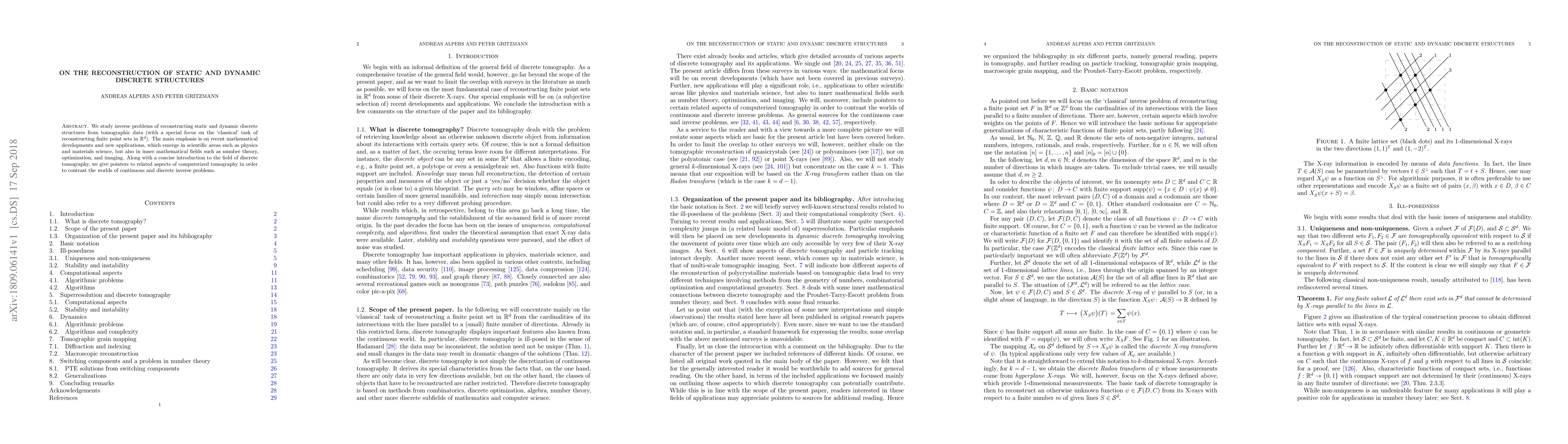 This paper explores the mathematical reconstruction of static and dynamic discrete structures from tomographic data, highlighting recent advancements and applications in physics, materials science, number theory, optimization, and imaging, while contrasting discrete and continuous inverse problems.