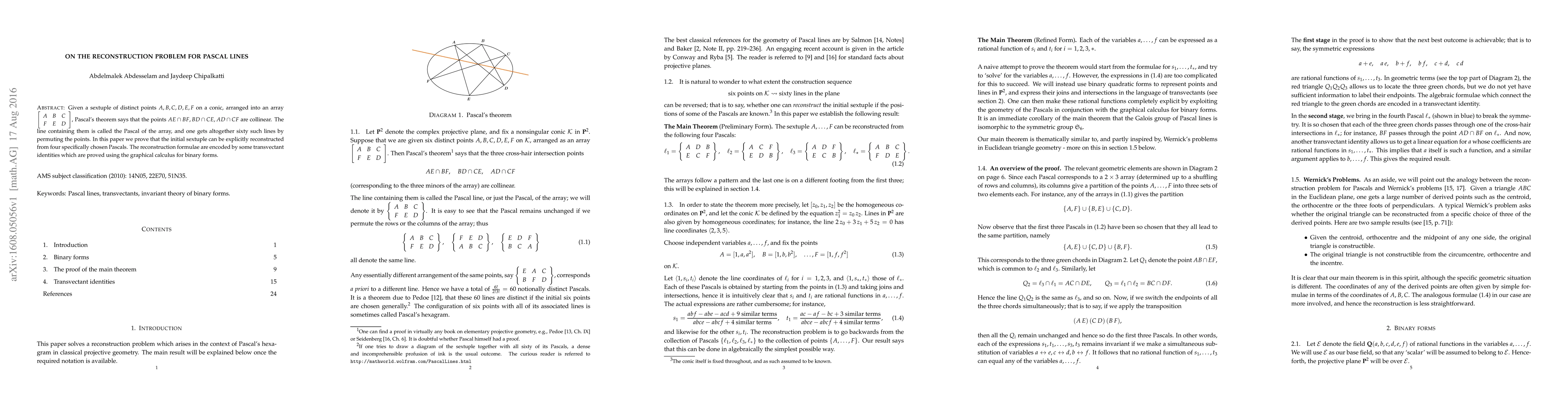 Researchers prove that a sextuple of distinct points on a conic can be explicitly reconstructed from just four specifically chosen Pascal lines, using transvectant identities and graphical calculus.