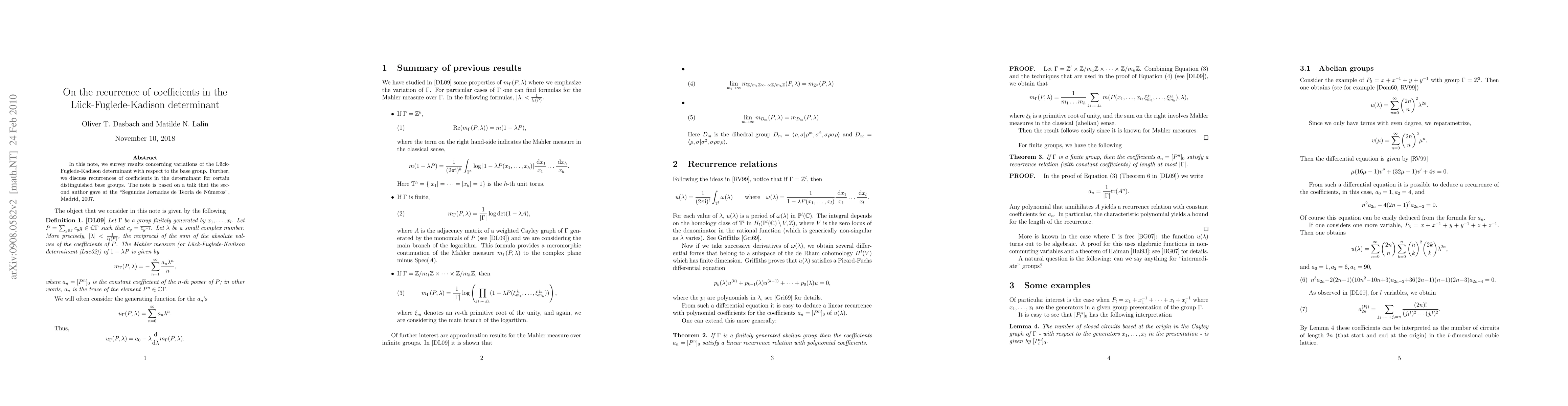 This paper surveys variations of the L\"uck-Fuglede-Kadison determinant with respect to the base group and explores recurrences of coefficients in the determinant for specific distinguished base groups. The findings are based on a talk presented by the second author at the "Segundas Jornadas de Teor\'ia de N\'umeros" in Madrid, 2007.