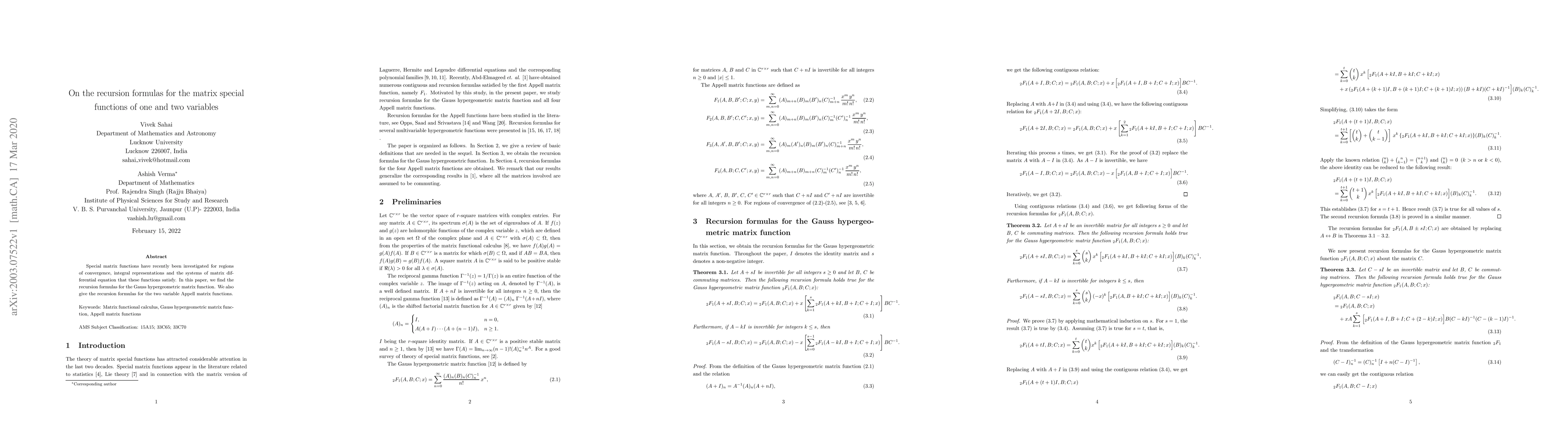 The paper finds recursion formulas for special matrix functions of one and two variables, expanding on recent investigations into regions of convergence and integral representations.