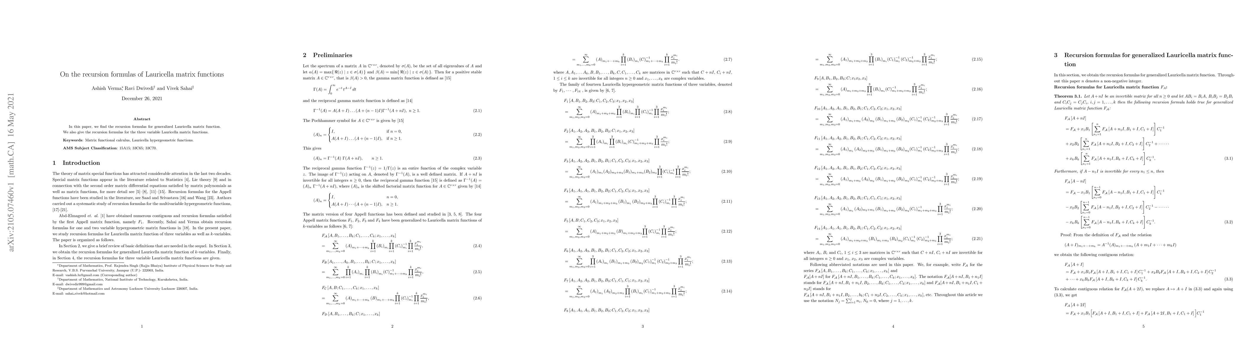 This paper derives recursion formulas for generalized and three-variable Lauricella matrix functions, providing a systematic approach to understanding their behavior and properties. The findings are significant for advancing the study of matrix functions in higher dimensions.