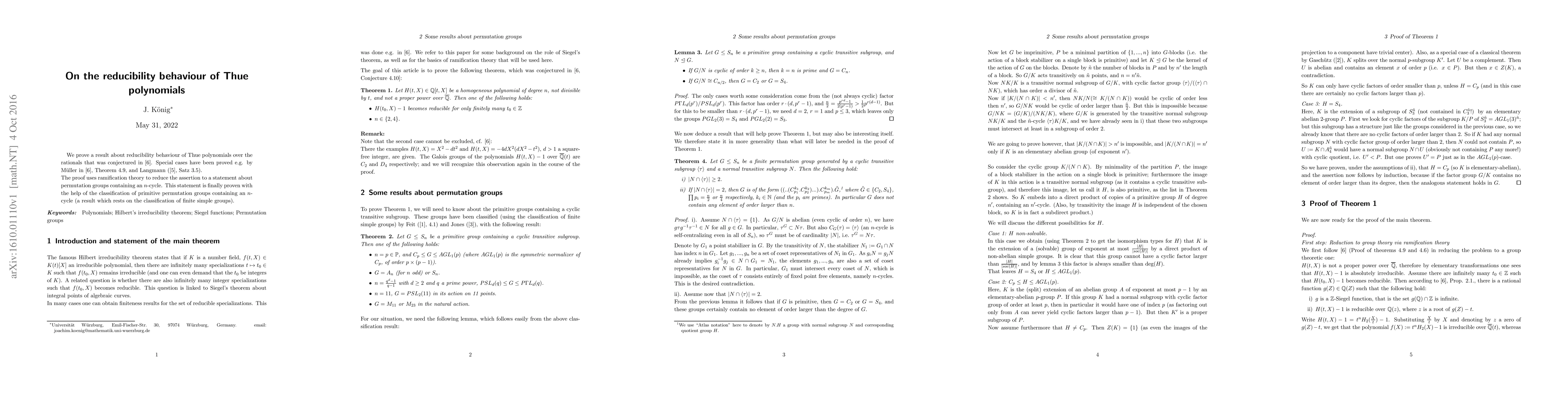 We prove a result about reducibility behaviour of Thue polynomials over the rationals that was conjectured by M\"uller. More precisely, we show that, apart from few explicitly given exceptions, these polynomials have only finitely many reducible integer specializations. Special cases have been proved e.g. by M\"uller and Langmann. The proof uses ramification theory to reduce the assertion to a statement about permutation groups containing an $n$-cycle. This statement is finally proven with the help of the classification of primitive permutation groups containing an $n$-cycle (a result which rests on the classification of finite simple groups).