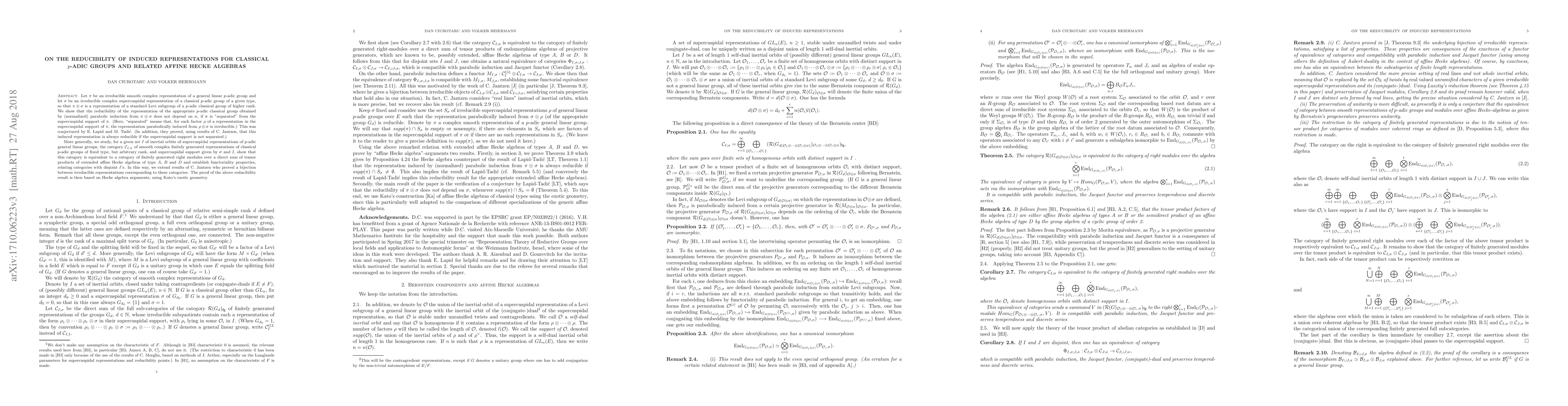 Let $\pi $ be an irreducible smooth complex representation of a general linear $p$-adic group and let $\sigma $ be an irreducible complex supercuspidal representation of a classical $p$-adic group of a given type, so that $\pi\otimes\sigma $ is a representation of a standard Levi subgroup of a $p$-adic classical group of higher rank. We show that the reducibility of the representation of the appropriate $p$-adic classical group obtained by (normalized) parabolic induction from $\pi\otimes\sigma $ does not depend on $\sigma $, if $\sigma $ is "separated" from the supercuspidal support of $\pi $. (Here, "separated" means that, for each factor $\rho $ of a representation in the supercuspidal support of $\pi $, the representation parabolically induced from $\rho\otimes\sigma $ is irreducible.) This was conjectured by E. Lapid and M. Tadi\'c. (In addition, they proved, using results of C. Jantzen, that this induced representation is always reducible if the supercuspidal support is not separated.) More generally, we study, for a given set $I$ of inertial orbits of supercuspidal representations of $p$-adic general linear groups, the category $\CC _{I,\sigma}$ of smooth complex finitely generated representations of classical $p$-adic groups of fixed type, but arbitrary rank, and supercuspidal support given by $\sigma $ and $I$, show that this category is equivalent to a category of finitely generated right modules over a direct sum of tensor products of extended affine Hecke algebras of type $A$, $B$ and $D$ and establish functoriality properties, relating categories with disjoint $I$'s. In this way, we extend results of C. Jantzen who proved a bijection between irreducible representations corresponding to these categories. The proof of the above reducibility result is then based on Hecke algebra arguments, using Kato's exotic geometry.