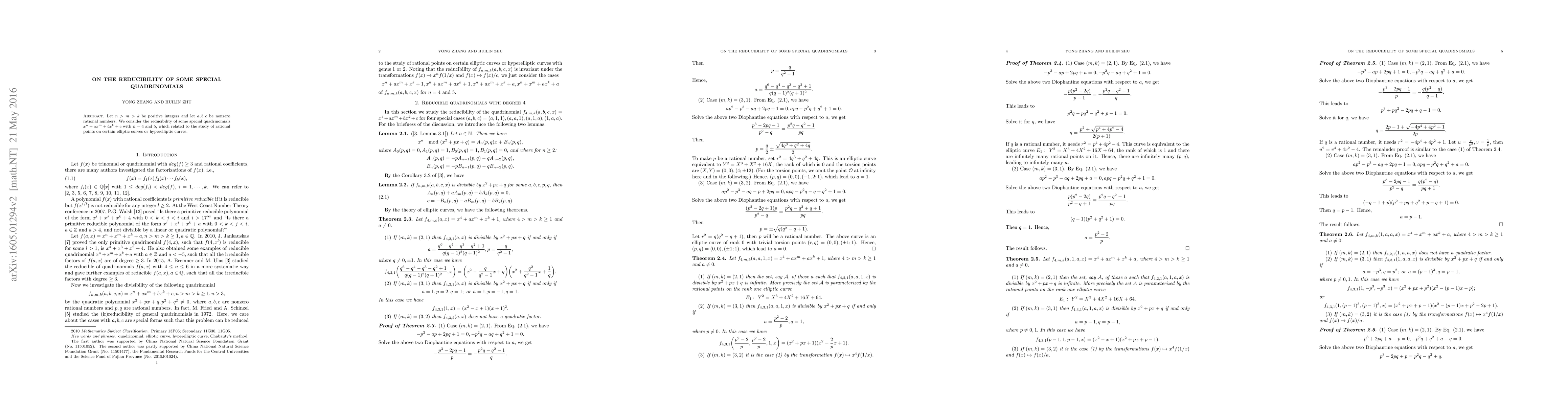 Let $n>m>k$ be positive integers and let $a,b,c$ be nonzero rational numbers. We consider the reducibility of some special quadrinomials $x^n+ax^m+bx^k+c$ with $n=4$ and 5, which related to the study of rational points on certain elliptic curves or hyperelliptic curves.