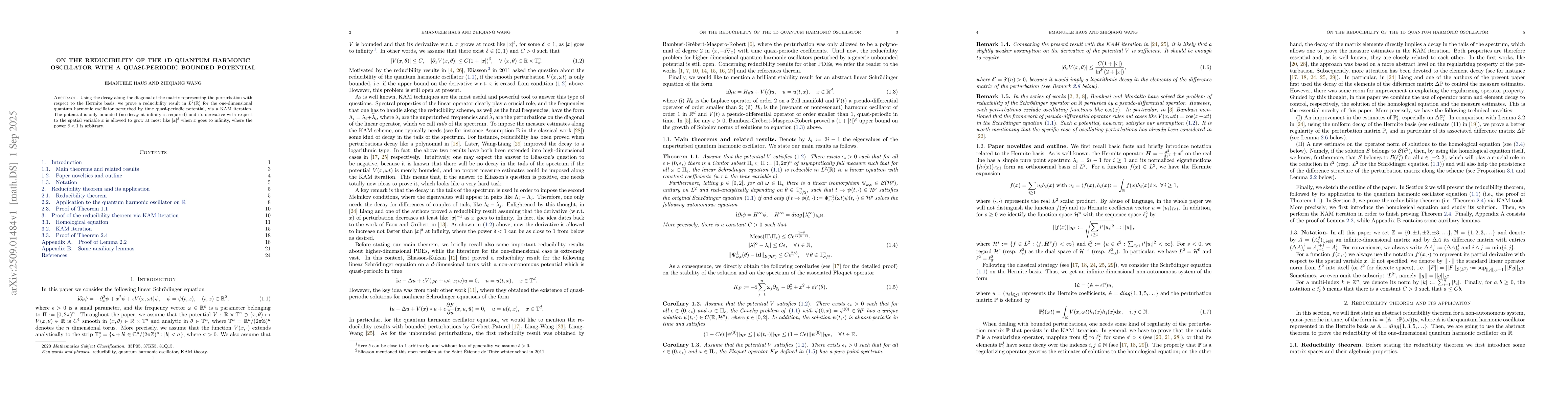 Using the decay along the diagonal of the matrix representing the perturbation with respect to the Hermite basis, we prove a reducibility result in $L^2(\mathbb{R})$ for the one-dimensional quantum harmonic oscillator perturbed by time quasi-periodic potential, via a KAM iteration. The potential is only bounded (no decay at infinity is required) and its derivative with respect to the spatial variable $x$ is allowed to grow at most like $|x|^\delta$ when $x$ goes to infinity, where the power $\delta<1$ is arbitrary.