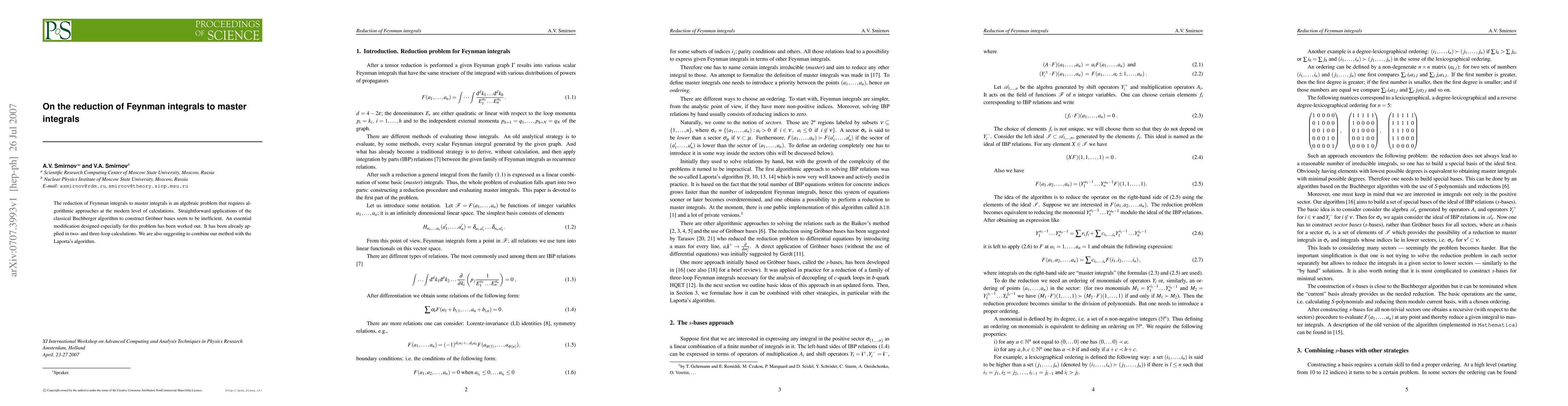 The reduction of Feynman integrals to master integrals is an algebraic problem that requires algorithmic approaches at the modern level of calculations. Straightforward applications of the classical Buchberger algorithm to construct Groebner bases seem to be inefficient. An essential modification designed especially for this problem has been worked out. It has been already applied in two- and three-loop calculations. We are also suggesting to combine our method with the Laporta's algorithm.