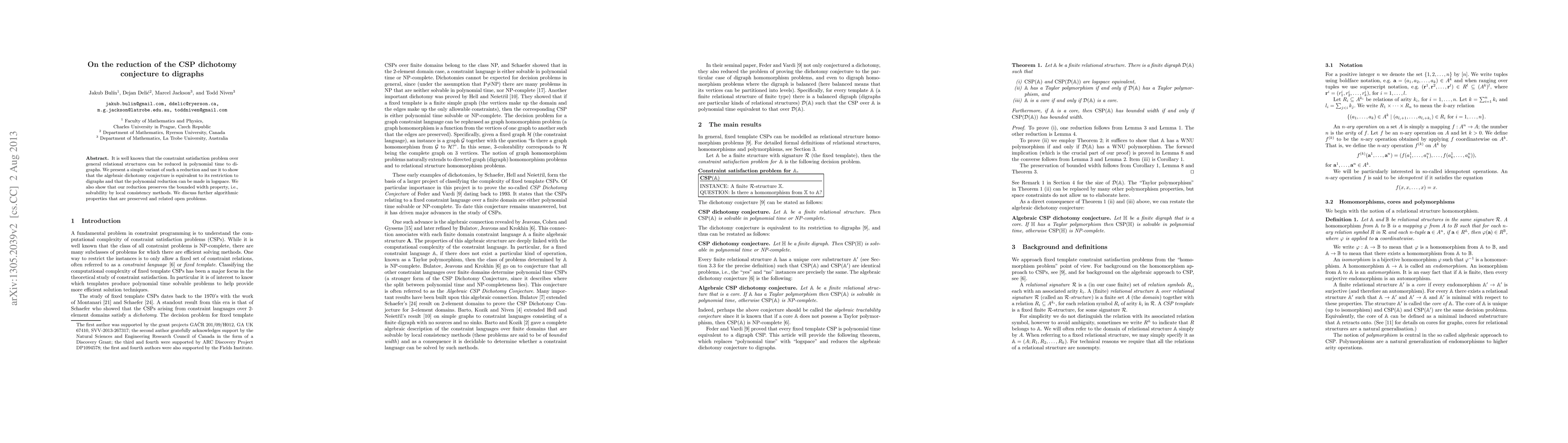 This paper presents a polynomial-time reduction from the CSP dichotomy conjecture to digraphs, demonstrating that the conjecture holds equivalently for digraphs. The reduction is shown to be logspace and preserves the bounded width property, highlighting preserved algorithmic properties and discussing related open problems.