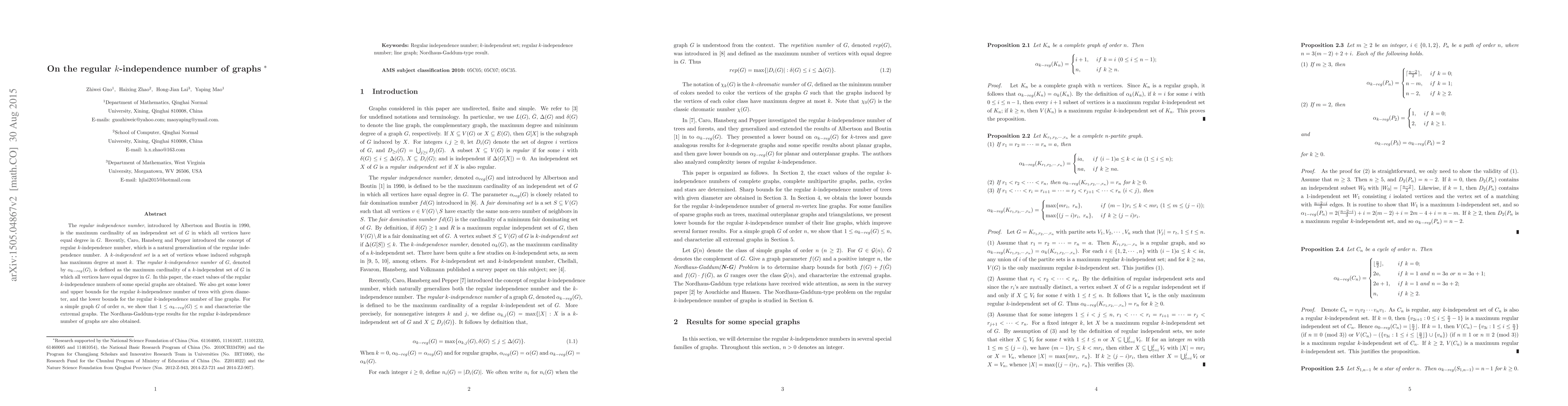 The \emph{regular independence number}, introduced by Albertson and Boutin in 1990, is the maximum cardinality of an independent set of $G$ in which all vertices have equal degree in $G$. Recently, Caro, Hansberg and Pepper introduced the concept of regular $k$-independence number, which is a natural generalization of the regular independence number. A \emph{$k$-independent set} is a set of vertices whose induced subgraph has maximum degree at most $k$. The \emph{regular $k$-independence number} of $G$, denoted by $\alpha_{k-reg}(G)$, is defined as the maximum cardinality of a $k$-independent set of $G$ in which all vertices have equal degree in $G$. In this paper, the exact values of the regular $k$-independence numbers of some special graphs are obtained. We also get some lower and upper bounds for the regular $k$-independence number of trees with given diameter, and the lower bounds for the regular $k$-independence number of line graphs. For a simple graph $G$ of order $n$, we show that $1\leq\alpha_{k-reg}(G)\leq n$ and characterize the extremal graphs. The Nordhaus-Gaddum-type results for the regular $k$-independence number of graphs are also obtained.