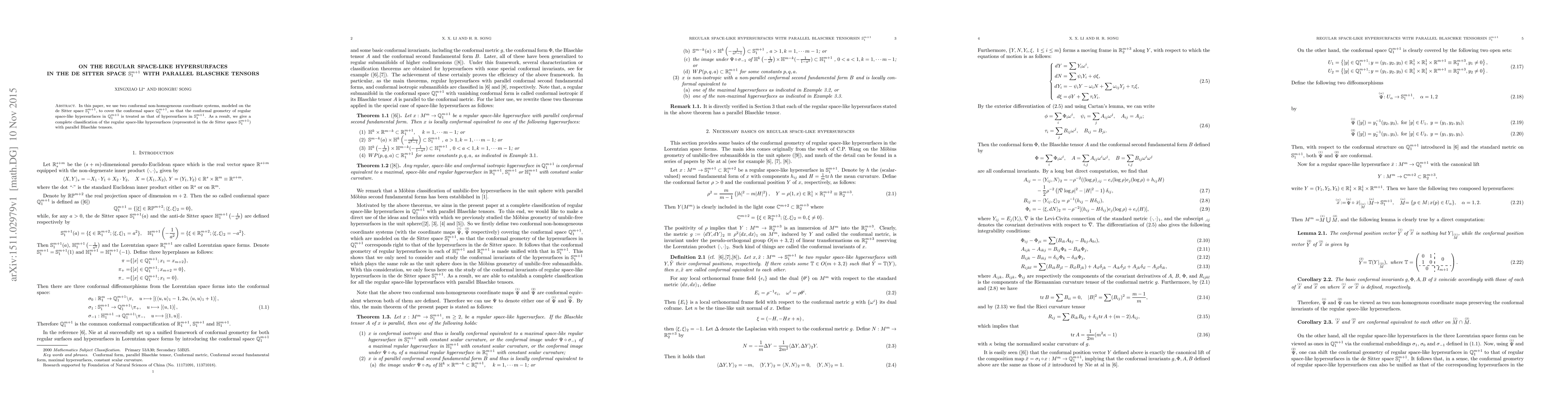This paper classifies regular space-like hypersurfaces in the conformal space ${\mathbb Q}^{m+1}_1$ using two conformal non-homogeneous coordinate systems modeled on de Sitter space ${\mathbb S}^{m+1}_1$, focusing on those with parallel Blaschke tensors.