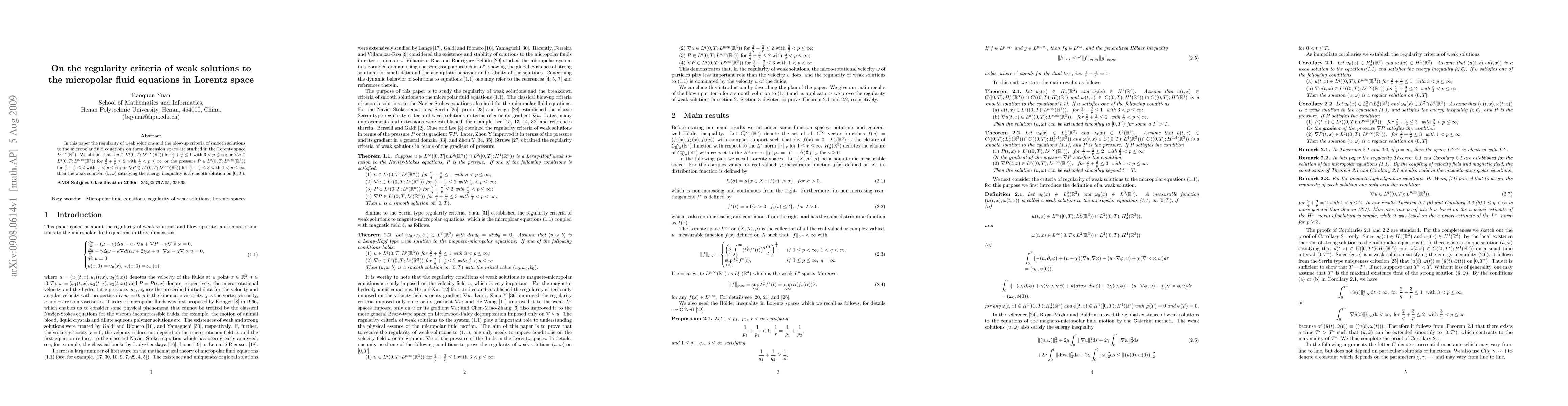 In this paper the regularity of weak solutions and the blow-up criteria of smooth solutions to the micropolar fluid equations on three dimension space are studied in the Lorentz space $L^{p,\infty}(\mathbb{R}^3)$. We obtain that if $u\in L^q(0,T;L^{p,\infty}(\mathbb{R}^3))$ for $\frac2q+\frac3p\le 1$ with $3