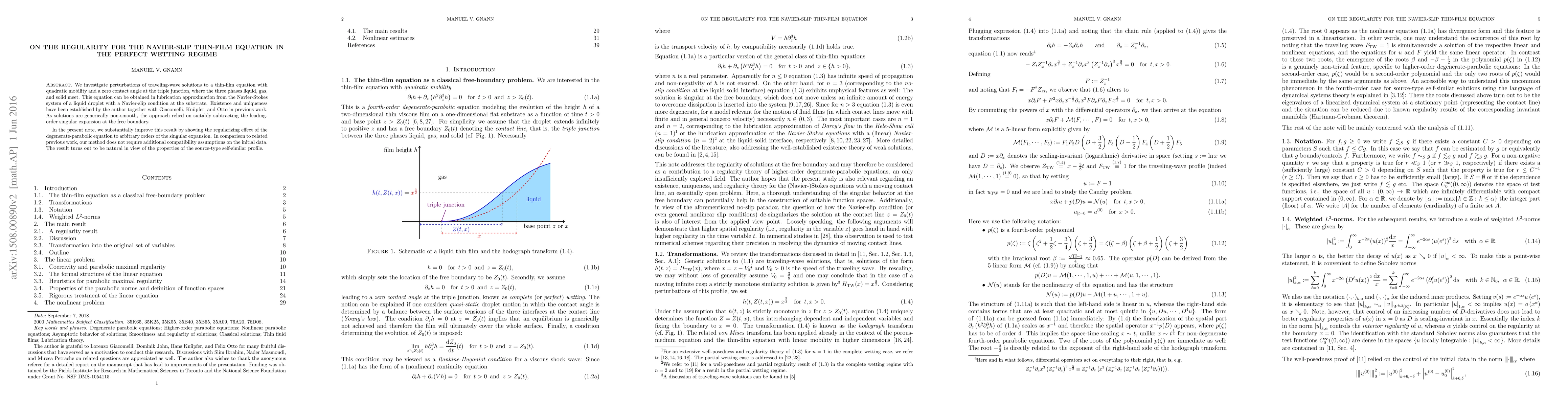We investigate perturbations of traveling wave solutions to a thin-film equation with quadratic mobility and a zero contact angle at the triple junction, where the three phases liquid, gas, and solid meet. This equation can be obtained in lubrication approximation from the Navier-Stokes system of a liquid droplet with a Navier-slip condition at the substrate. Existence and uniqueness have been established by the author together with Giacomelli, Kn\"upfer, and Otto in previous work. As solutions are generically non-smooth, the approach relied on suitably subtracting the leading-order singular expansion at the free boundary. In the present note, we substantially improve this result by showing the regularizing effect of the degenerate-parabolic equation to arbitrary orders of the singular expansion. In comparison to related previous work, our method does not require additional compatibility assumptions on the initial data. The result turns out to be natural in view of the properties of the source-type self-similar profile.