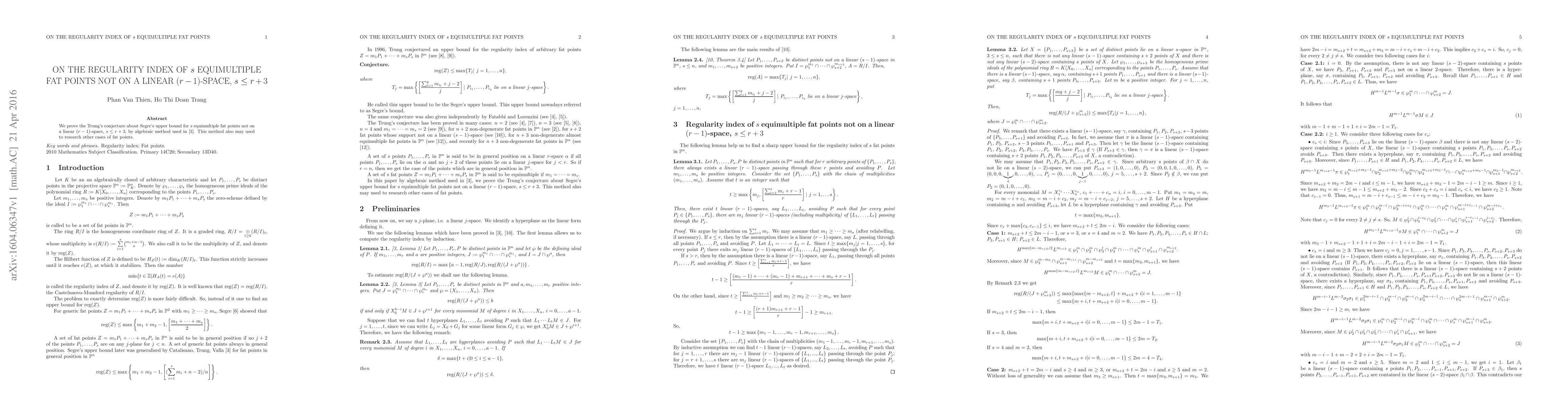 We prove the Trung's conjecture about Segre's upper bound for s equimultiple fat points not on a linear (r-1)-space, s\le r+3, by algebraic method used in [3]. This method also may used to research other cases of fat points.