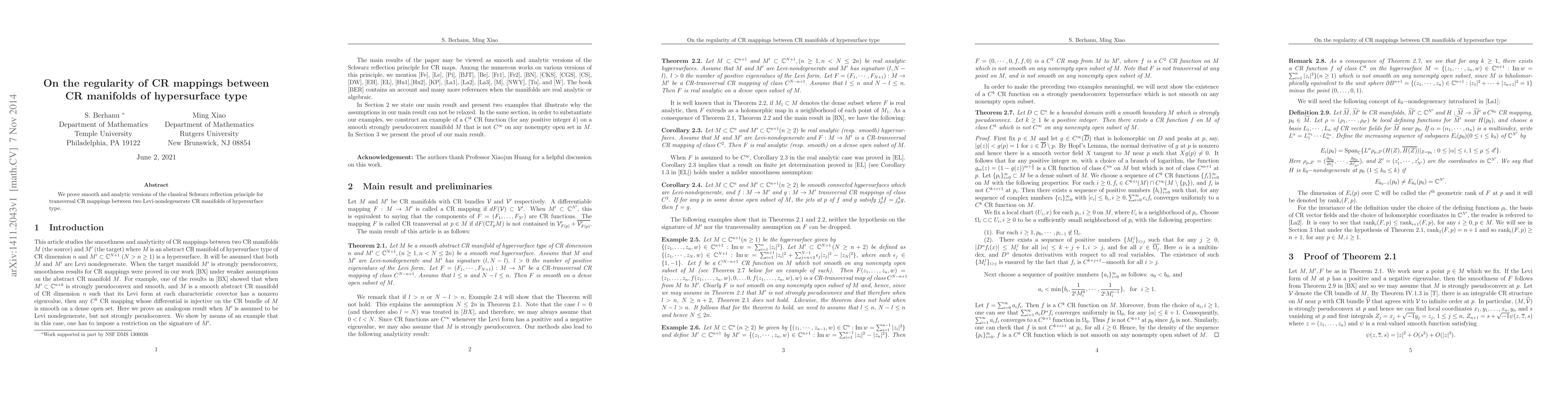 This paper proves smooth and analytic versions of the Schwarz reflection principle for transversal CR mappings between two CR manifolds of hypersurface type, establishing the regularity of such mappings.