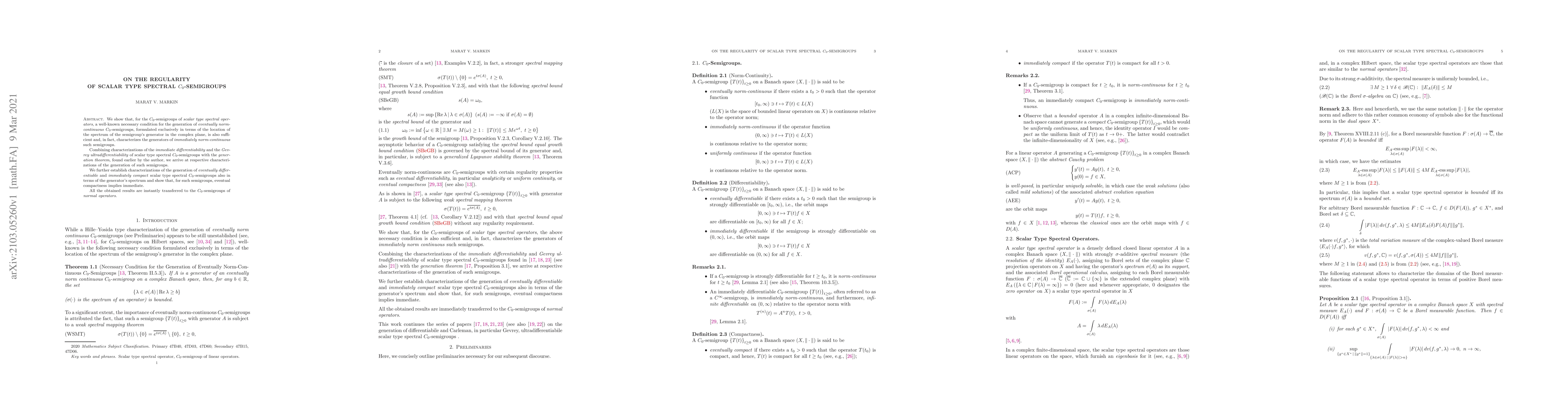 We show that, for the $C_0$-semigroups of scalar type spectral operators, a well-known necessary condition for the generation of eventually norm-continuous $C_0$-semigroups, formulated exclusively in terms of the location of the spectrum of the semigroup's generator in the complex plane, is also sufficient and, in fact, characterizes the generators of immediately norm-continuous such semigroups. Combining characterizations of the immediate differentiability and the Gevrey ultradifferentiability of scalar type spectral $C_0$-semigroups with the generation theorem, found earlier by the author, we arrive at respective characterizations of the generation of such semigroups. We further establish characterizations of the generation of eventually differentiable and immediately compact scalar type spectral $C_0$-semigroups also in terms of the generator's spectrum and show that, for such semigroups, eventual compactness implies immediate. All the obtained results are instantly transferred to the $C_0$-semigroups of normal operators.