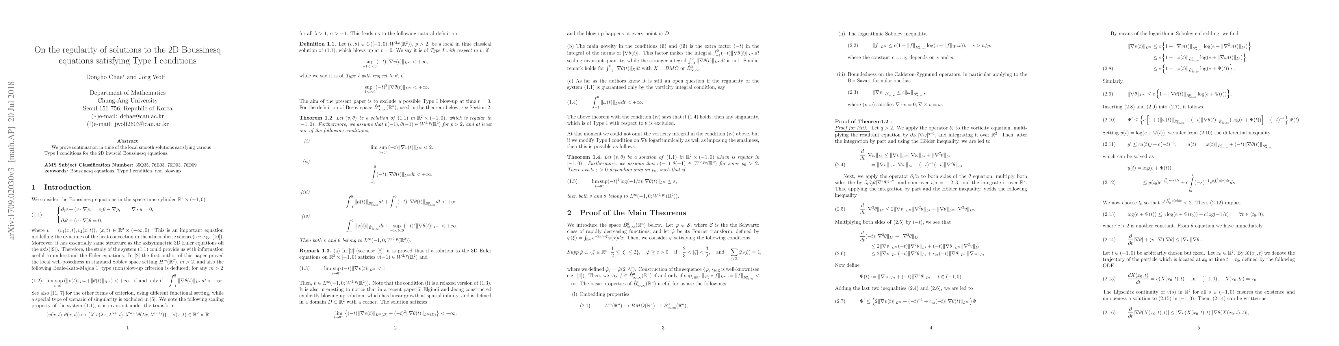 This research proves that local smooth solutions of the 2D Boussinesq equations, under Type I conditions, can continue in time without losing regularity.