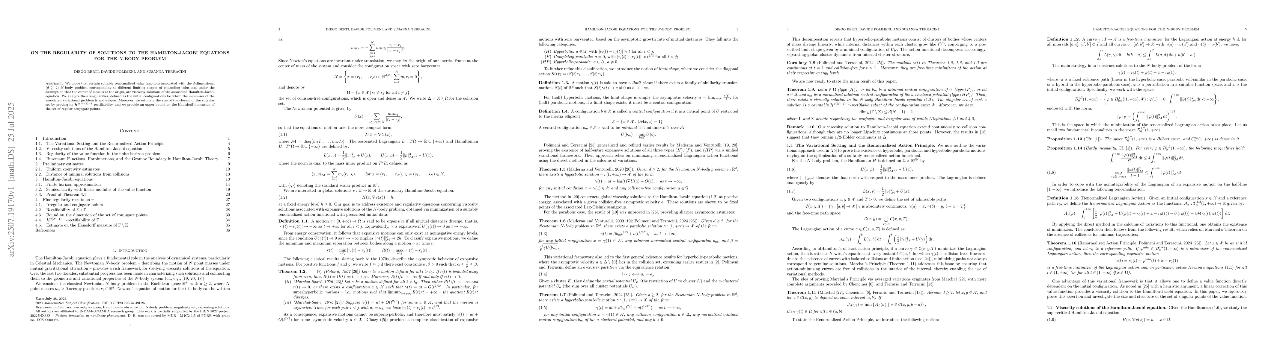 We prove that certain suitably renormalized value functions associated with the $d$-dimensional ($d\geq2$) $N$-body problem corresponding to different limiting shapes of expanding solutions, under the assumption that the center of mass is at the origin, are viscosity solutions of the associated Hamilton-Jacobi equation. We analyze their singularities, defined as the initial configurations for which the minimizer of the associated variational problem is not unique. Moreover, we estimate the size of the closure of the singular set by proving its $\mathcal{H}^{d(N-1)-1}$-rectifiability, and we provide an upper bound on the Hausdorff dimension of the set of regular conjugate points.