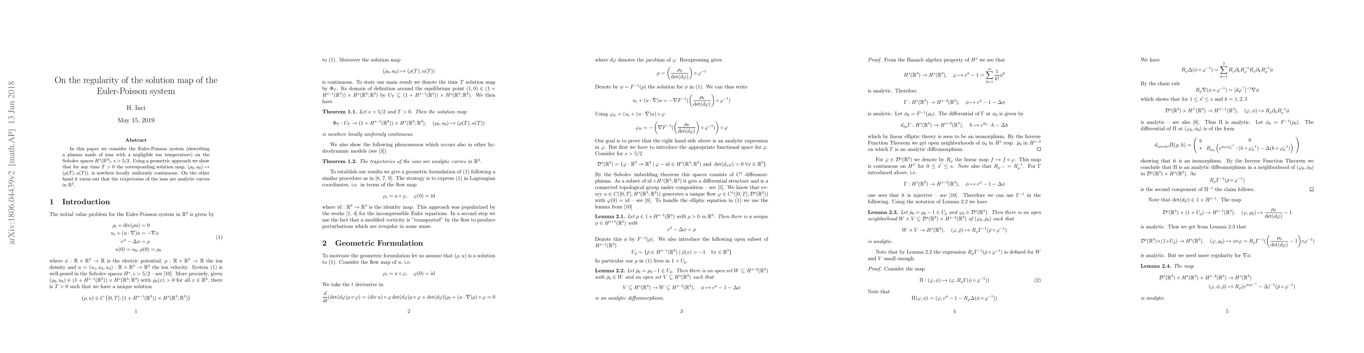 This research demonstrates that the solution map of the Euler-Poisson system, describing a plasma of ions with negligible ion temperature, lacks local uniform continuity on Sobolev spaces H^s(R^3), s > 5/2. Despite this, ion trajectories are shown to be analytic curves in R^3.