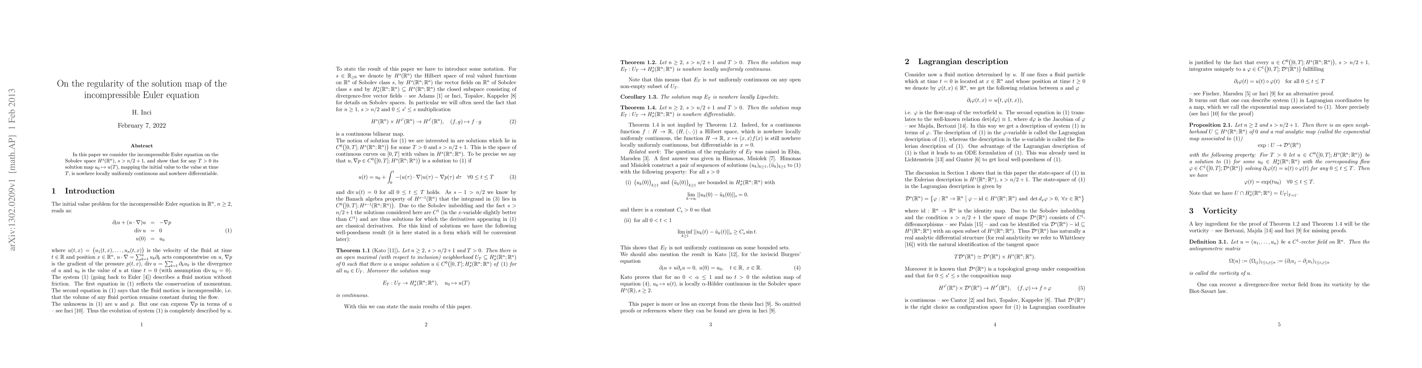 This paper demonstrates that the solution map for the incompressible Euler equation on the Sobolev space $H^s(\R^n)$ with $s > n/2+1$ is neither locally uniformly continuous nor differentiable for any $T > 0$. This highlights the irregular nature of solutions to the Euler equation under these conditions.