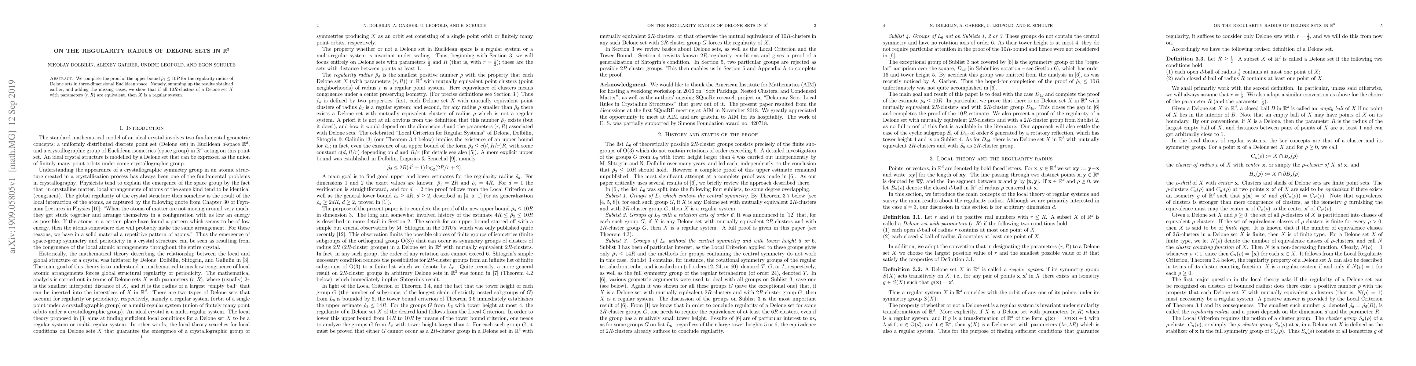 Summary: This paper completes the proof for the upper bound $\hat\rho_3\leq 10R$ on the regularity radius of Delone sets in $\mathbb{R}^3$, demonstrating that if all $10R$-clusters of a Delone set $X$ are equivalent, then $X$ qualifies as a regular system.