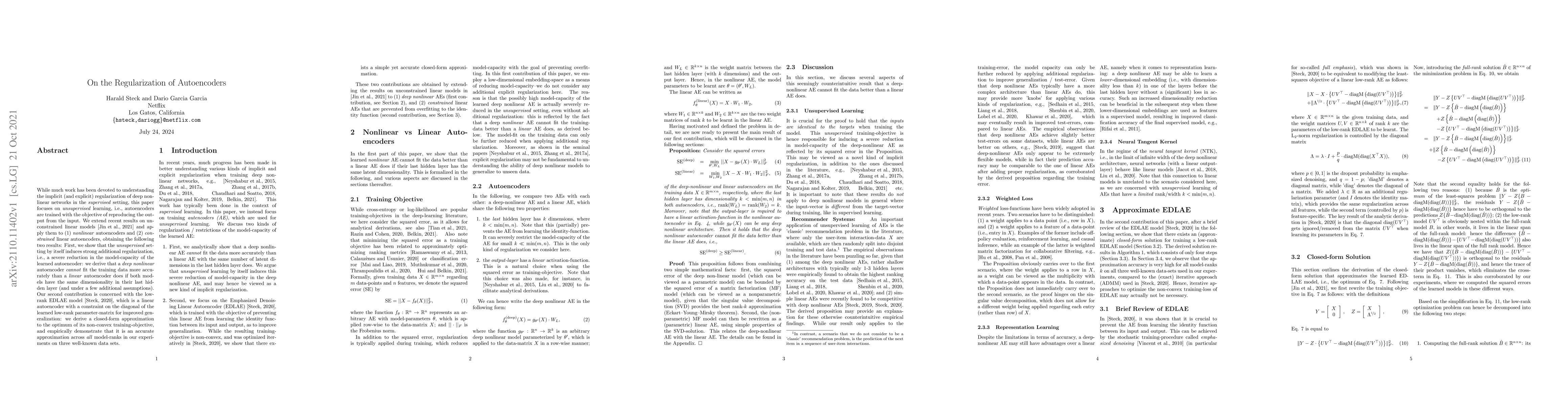 While much work has been devoted to understanding the implicit (and explicit) regularization of deep nonlinear networks in the supervised setting, this paper focuses on unsupervised learning, i.e., autoencoders are trained with the objective of reproducing the output from the input. We extend recent results [Jin et al. 2021] on unconstrained linear models and apply them to (1) nonlinear autoencoders and (2) constrained linear autoencoders, obtaining the following two results: first, we show that the unsupervised setting by itself induces strong additional regularization, i.e., a severe reduction in the model-capacity of the learned autoencoder: we derive that a deep nonlinear autoencoder cannot fit the training data more accurately than a linear autoencoder does if both models have the same dimensionality in their last hidden layer (and under a few additional assumptions). Our second contribution is concerned with the low-rank EDLAE model [Steck 2020], which is a linear autoencoder with a constraint on the diagonal of the learned low-rank parameter-matrix for improved generalization: we derive a closed-form approximation to the optimum of its non-convex training-objective, and empirically demonstrate that it is an accurate approximation across all model-ranks in our experiments on three well-known data sets.
