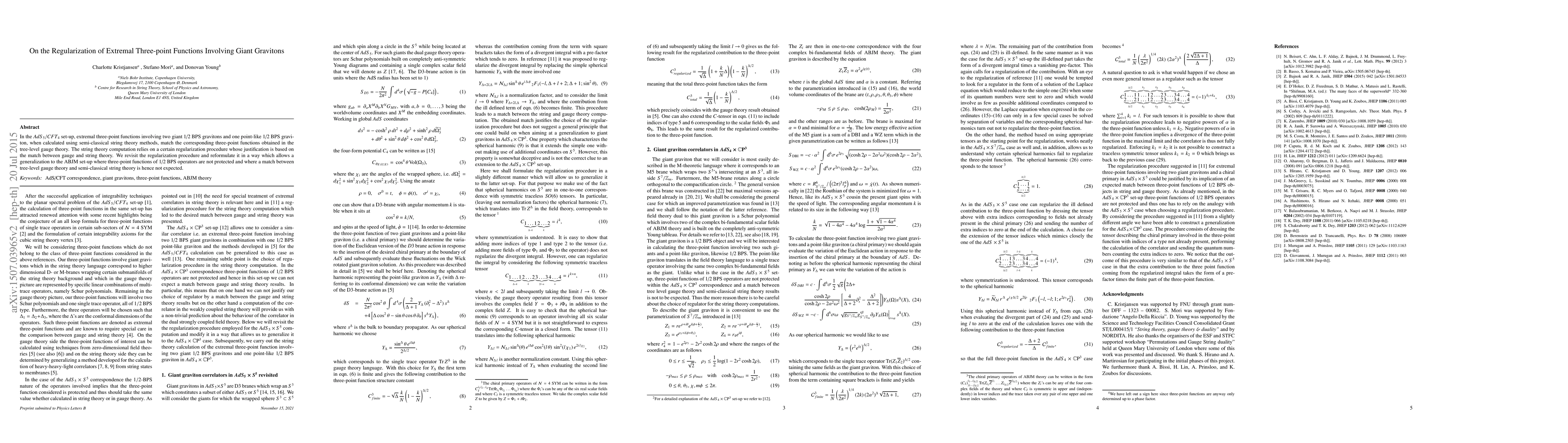This paper examines the regularization of extremal three-point functions in AdS_5/CFT_4 involving giant gravitons, demonstrating agreement between semi-classical string theory and tree-level gauge theory. It reformulates the regularization to extend applicability to the ABJM setup where such agreement is not anticipated.
