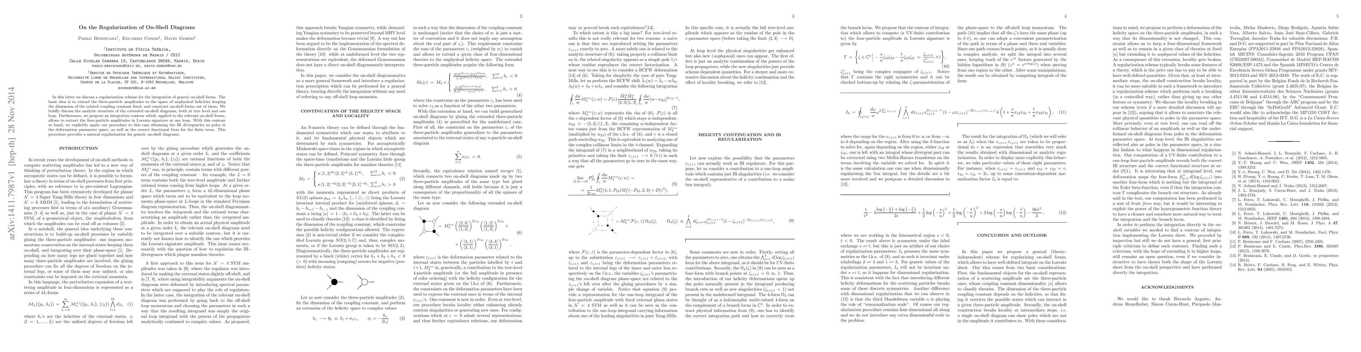 In this letter we discuss a regularization scheme for the integration of generic on-shell forms. The basic idea is to extend the three-particle amplitudes to the space of unphysical helicities keeping the dimension of the related coupling constant fixed, and construct on-shell forms out of them. We briefly discuss the analytic structure of the extended on-shell diagrams, both at tree level and one loop. Furthermore, we propose an integration contour which, applied to the relevant on-shell forms, allows to extract the four-particle amplitudes in Lorentz signature at one loop. With this contour at hand, we explicitly apply our procedure to this case obtaining the IR divergences as poles in the deformation parameter space, as well as the correct functional form for the finite term. This procedure provides a natural regularization for generic on-shell diagrams.