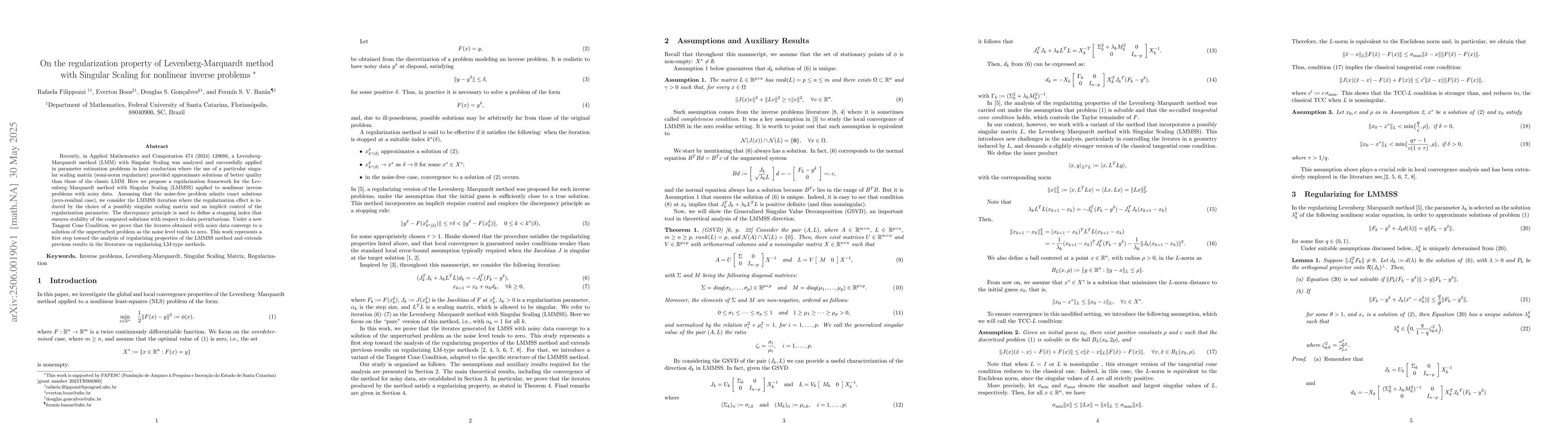 Recently, in Applied Mathematics and Computation 474 (2024) 128688, a Levenberg-Marquardt method (LMM) with Singular Scaling was analyzed and successfully applied in parameter estimation problems in heat conduction where the use of a particular singular scaling matrix (semi-norm regularizer) provided approximate solutions of better quality than those of the classic LMM. Here we propose a regularization framework for the Levenberg-Marquardt method with Singular Scaling (LMMSS) applied to nonlinear inverse problems with noisy data. Assuming that the noise-free problem admits exact solutions (zero-residual case), we consider the LMMSS iteration where the regularization effect is induced by the choice of a possibly singular scaling matrix and an implicit control of the regularization parameter. The discrepancy principle is used to define a stopping index that ensures stability of the computed solutions with respect to data perturbations. Under a new Tangent Cone Condition, we prove that the iterates obtained with noisy data converge to a solution of the unperturbed problem as the noise level tends to zero. This work represents a first step toward the analysis of regularizing properties of the LMMSS method and extends previous results in the literature on regularizing LM-type methods.