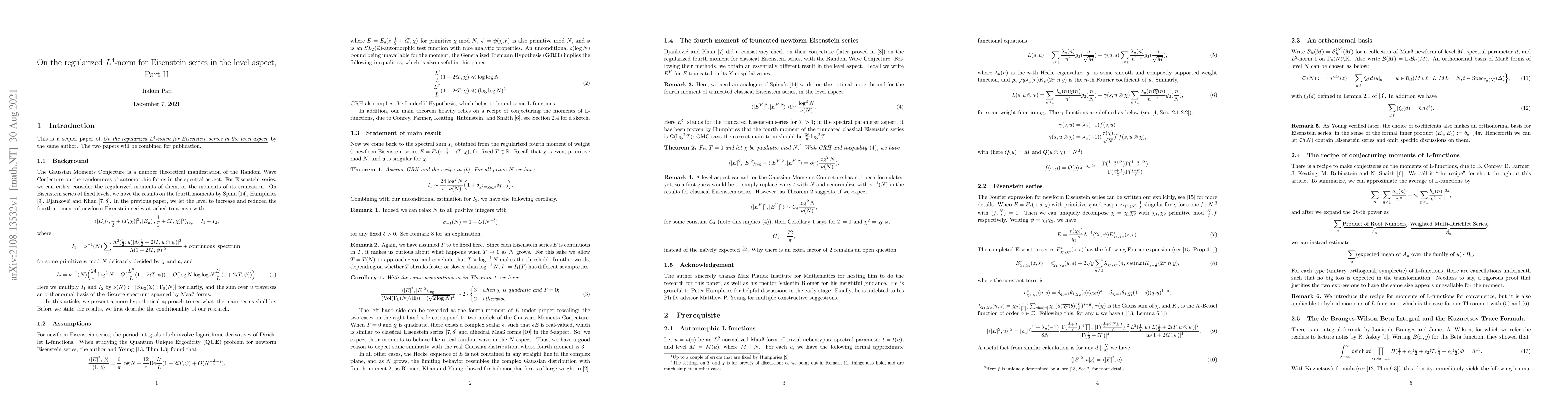 Researchers studied the regularized fourth moment of newform Eisenstein series, a key concept in number theory, and obtained a conditional result using a known recipe. This work builds upon previous findings on truncated newform Eisenstein series.