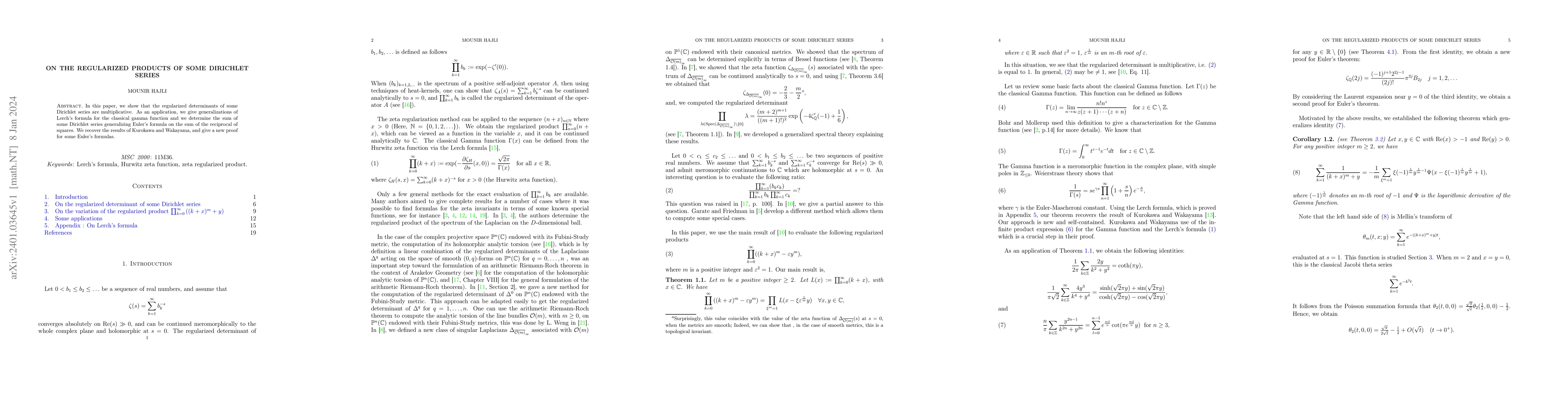 This paper demonstrates that the regularized determinants of certain Dirichlet series are multiplicative, and applies this to generalize Lerch's formula for the gamma function and derive new results for the sum of Dirichlet series, including a generalization of Euler's formula for the sum of reciprocal squares.
