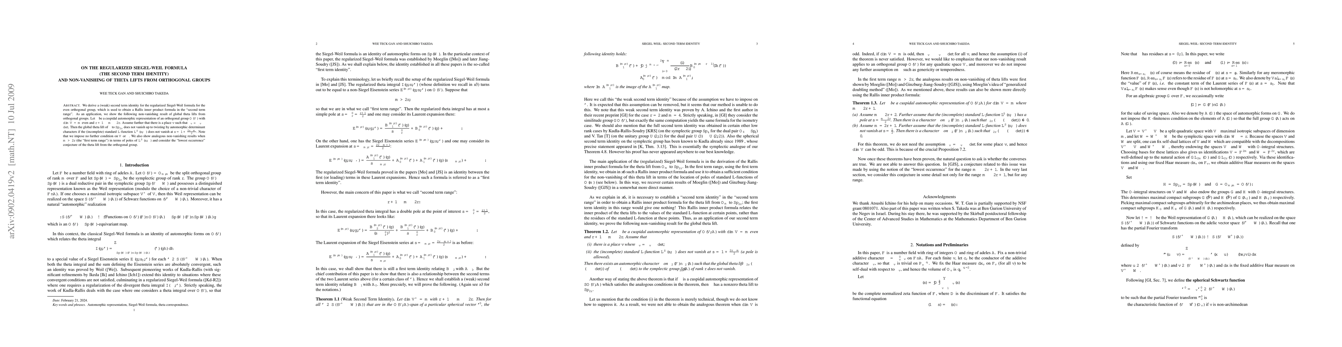 We derive a (weak) second term identity for the regularized Siegel-Weil formula for the even orthogonal group, which is used to obtain a Rallis inner product formula in the "second term range". As an application, we show the following non-vanishing result of global theta lifts from orthogonal groups. Let $\pi$ be a cuspidal automorphic representation of an orthogonal group $O(V)$ with $\dim V=m$ even and $r+1\leq m\leq 2r$. Assume further that there is a place $v$ such that $\pi_v\cong\pi_v\otimes\det$. Then the global theta lift of $\pi$ to $Sp_{2r}$ does not vanish up to twisting by automorphic determinant characters if the (incomplete) standard $L$-function $L^S(s,\pi)$ does not vanish at $s=1+\frac{2r-m}{2}$. Note that we impose no further condition on $V$ or $\pi$. We also show analogous non-vanishing results when $m > 2r$ (the "first term range") in terms of poles of $L^S(s,\pi)$ and consider the "lowest occurrence" conjecture of the theta lift from the orthogonal group.