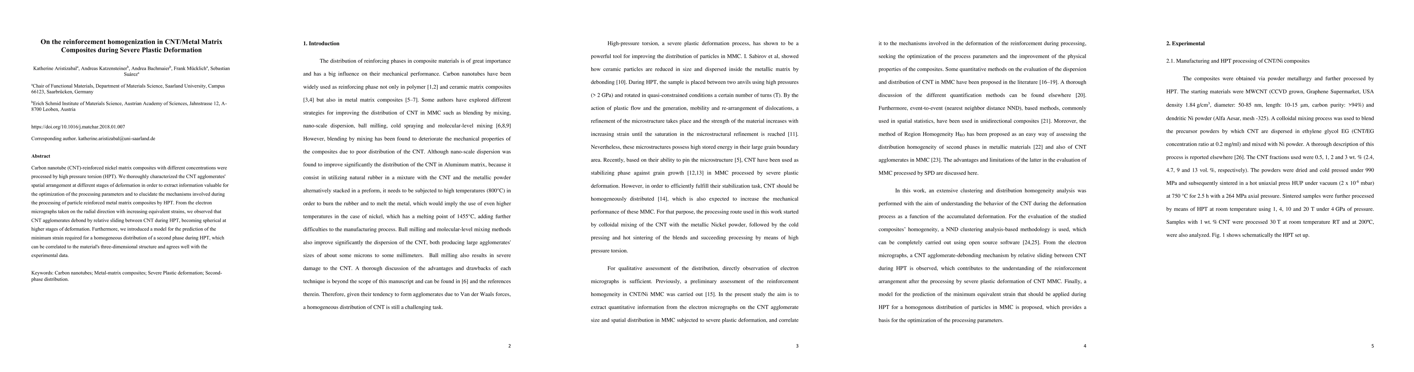 This paper investigates the reinforcement homogenization in carbon nanotube (CNT)-nickel matrix composites processed by high pressure torsion (HPT). The study reveals that CNT agglomerates debond and become spherical with increasing deformation, and proposes a model predicting the minimum strain for homogeneous distribution, correlating well with experimental observations.
