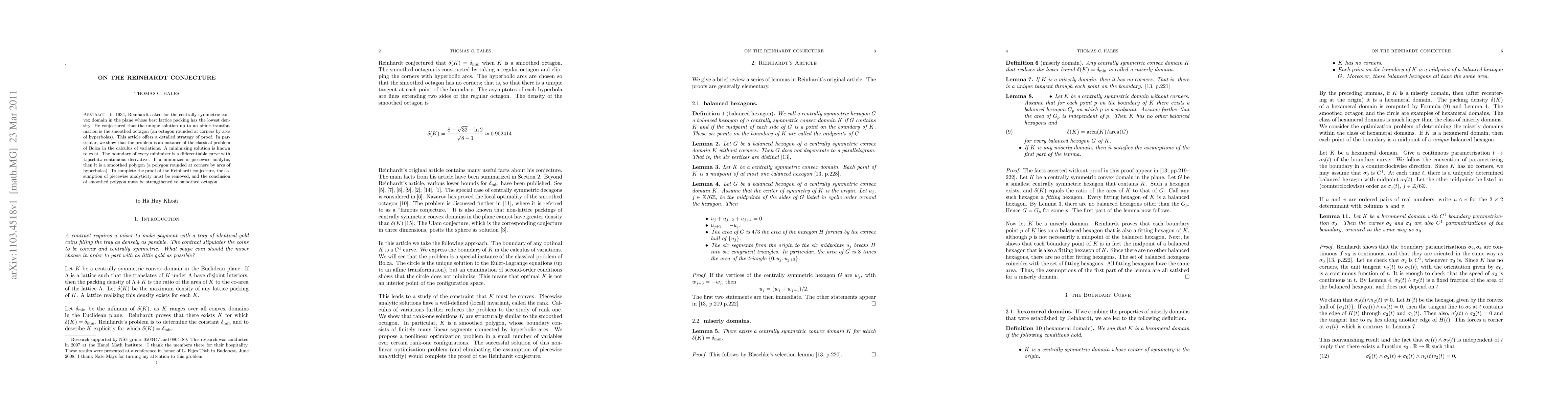 This paper proposes a strategy to prove the Reinhardt Conjecture, which posits that the smoothed octagon is the optimal centrally symmetric convex shape for lattice packing in the plane. The authors demonstrate that the problem is analogous to the classical Bolza problem in calculus of variations, and they show that minimizers have a differentiable boundary with Lipschitz continuous derivative.