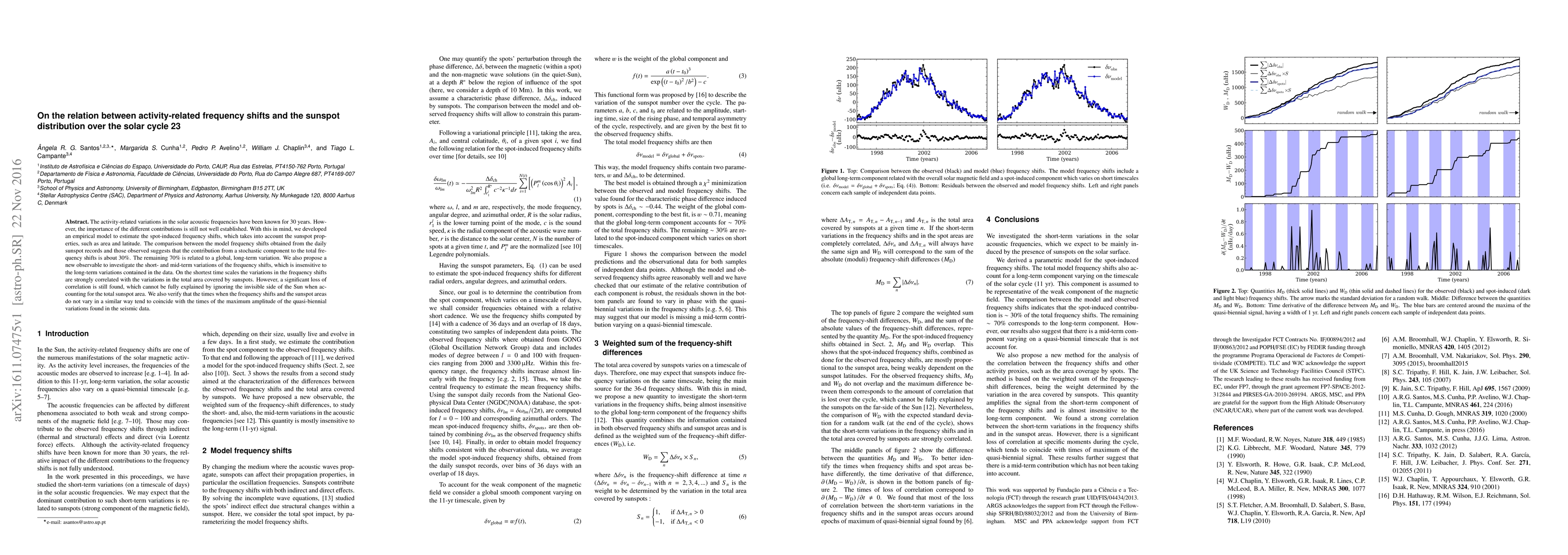 The activity-related variations in the solar acoustic frequencies have been known for 30 years. However, the importance of the different contributions is still not well established. With this in mind, we developed an empirical model to estimate the spot-induced frequency shifts, which takes into account the sunspot properties, such as area and latitude. The comparison between the model frequency shifts obtained from the daily sunspot records and those observed suggests that the contribution from a stochastic component to the total frequency shifts is about 30%. The remaining 70% is related to a global, long-term variation. We also propose a new observable to investigate the short- and mid-term variations of the frequency shifts, which is insensitive to the long-term variations contained in the data. On the shortest time scales the variations in the frequency shifts are strongly correlated with the variations in the total area covered by sunspots. However, a significant loss of correlation is still found, which cannot be fully explained by ignoring the invisible side of the Sun when accounting for the total sunspot area. We also verify that the times when the frequency shifts and the sunspot areas do not vary in a similar way tend to coincide with the times of the maximum amplitude of the quasi-biennial variations found in the seismic data.
