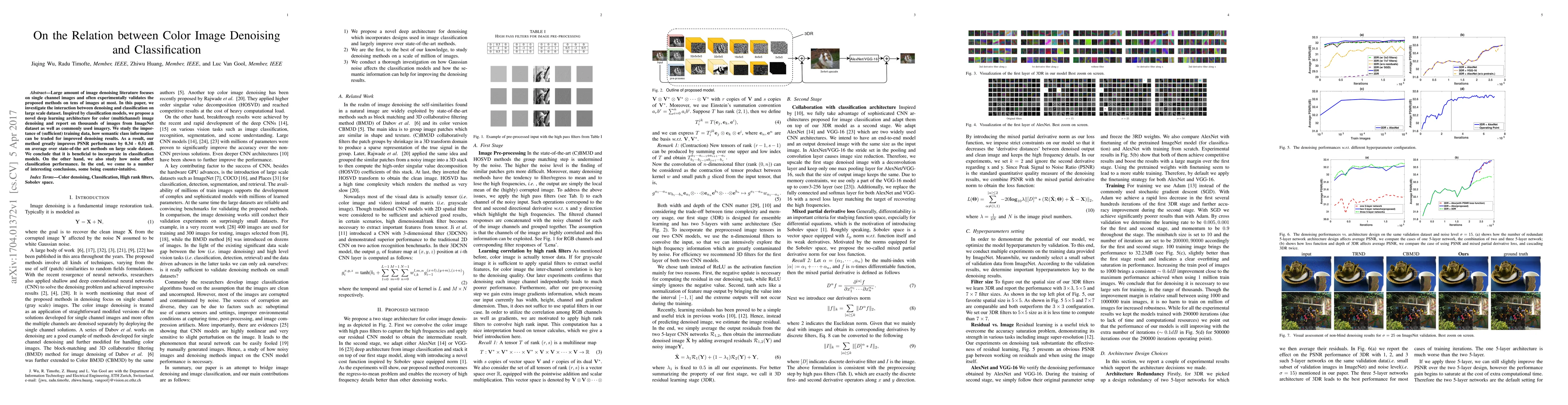 This paper proposes a novel deep learning architecture for color image denoising, demonstrating improved performance by leveraging classification models and large-scale datasets. The study finds that incorporating classification information enhances denoising results, leading to better PSNR performance, and explores the impact of noise on classification performance.
