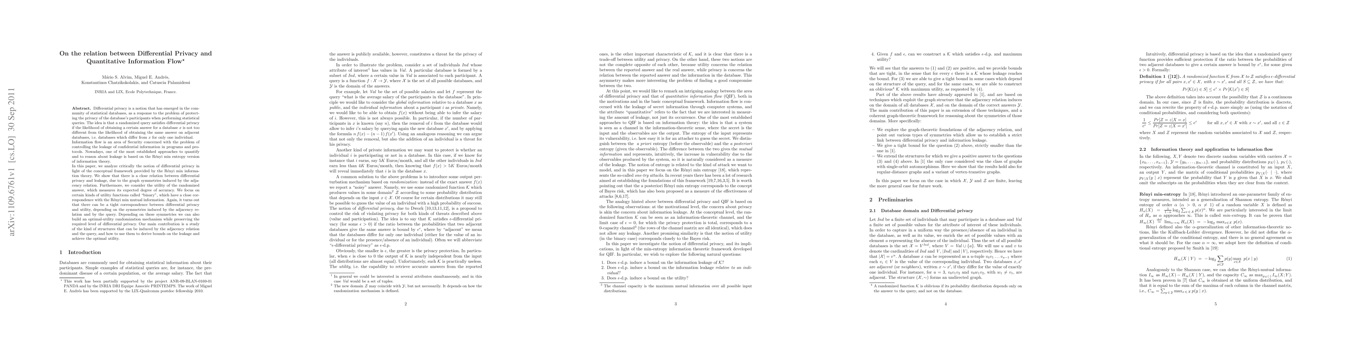 This paper explores the relationship between differential privacy and quantitative information flow, demonstrating that differential privacy and leakage are closely related due to graph symmetries from adjacency relations. It also investigates binary utility functions and their correspondence with R\'enyi min mutual information, showing how optimal utility can be achieved while maintaining differential privacy through specific structural symmetries.