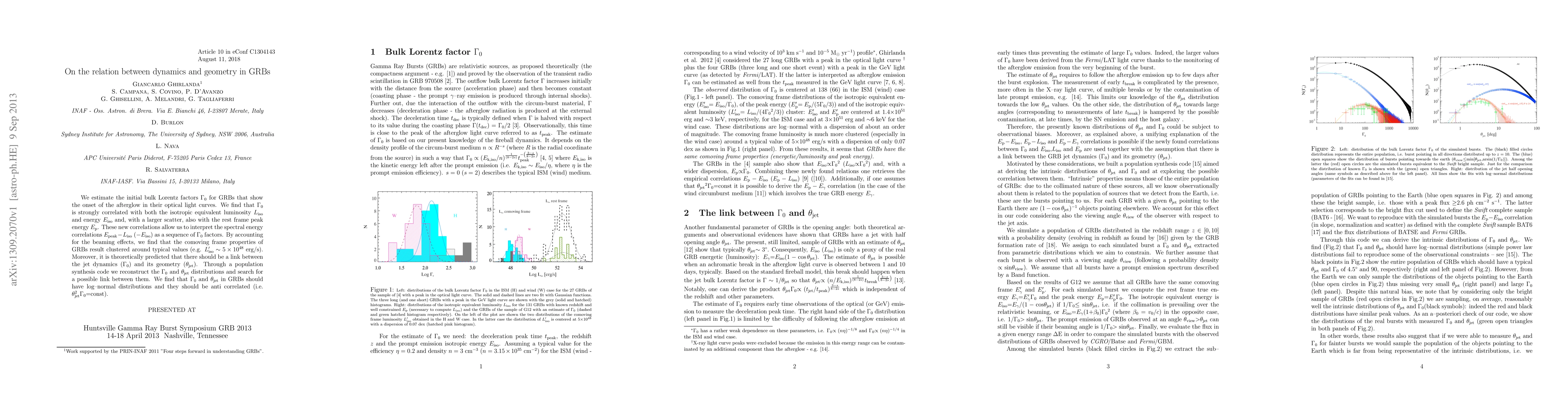 We estimate the initial bulk Lorentz factors Gamma_0 for GRBs that show the onset of the afterglow in their optical light curves. We find that Gamma_0 is strongly correlated with both the isotropic equivalent luminosity L_iso and energy E_iso and, with a larger scatter, also with the rest frame peak energy E_peak. These new correlations allow us to interpret the spectral energy correlations E_peak-L_iso (-E_iso) as a sequence of Gamma_0 factors. By accounting for the beaming effects, we find that the comoving frame properties of GRBs result clustered around typical values (e.g. L'_iso~5x10^48 erg/s). Moreover, it is theoretically predicted that there should be a link between the jet dynamics (Gamma_0) and its geometry (theta_jet). Through a population synthesis code we reconstruct the Gamma_0 and theta_jet distributions and search for a possible link between them. We find that Gamma_0 and theta_jet in GRBs should have log-normal distributions and they should be anti correlated (i.e. theta_jet^2*Gamma_0=const).