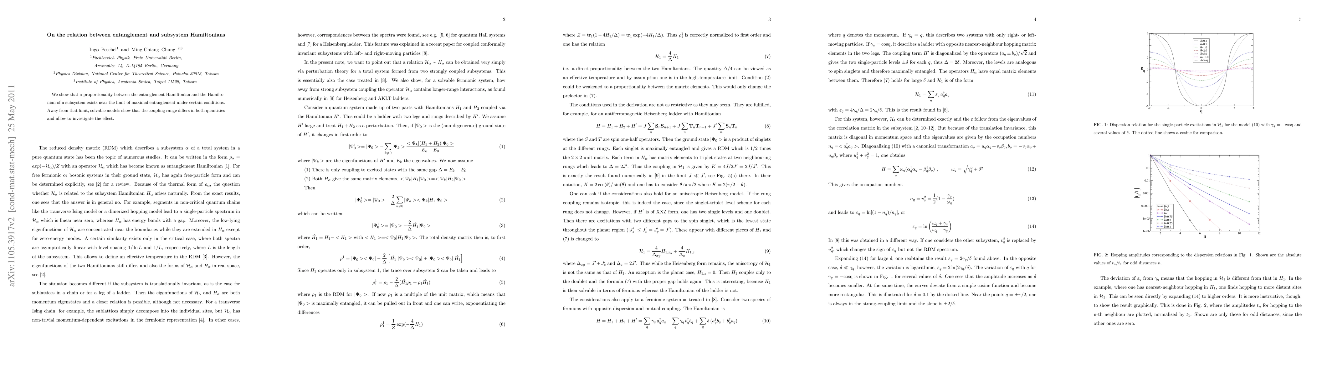 Researchers found a connection between entanglement and subsystem Hamiltonians under certain conditions, particularly near maximal entanglement, where the coupling range differs between the two quantities.
