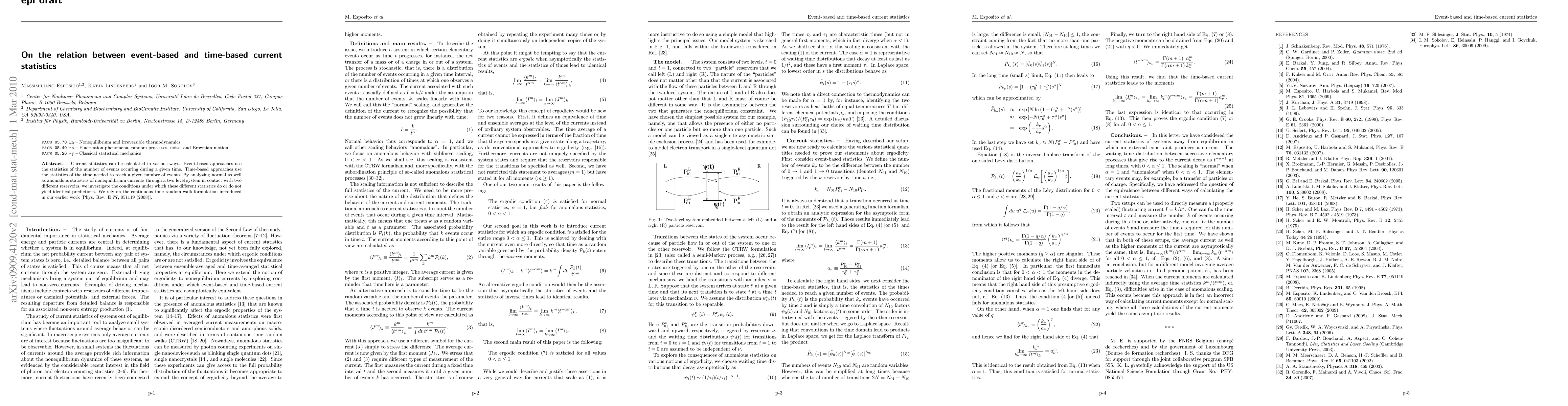 Current statistics can be calculated in various ways. Event-based approaches use the statistics of the number of events occuring during a given time. Time-based approaches use the statistics of the time needed to reach a given number of events. By analyzing normal as well as anomalous statistics of nonequilibrium currents through a two level system in contact with two different reservoirs, we investigate the conditions under which these different statistics do or do not yield identical predictions. We rely on the continuous time random walk formulation introduced in our earlier work [Phys. Rev. E 77, 051119 (2008)].