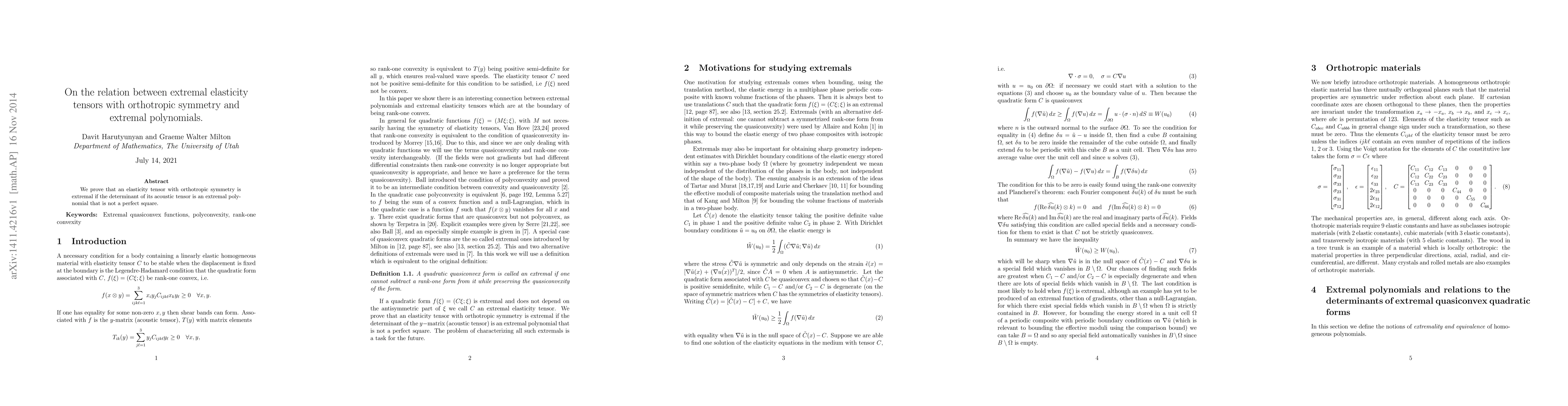 Summary: This paper establishes a connection between extremal elasticity tensors with orthotropic symmetry and extremal polynomials. It demonstrates that such tensors are extremal when the determinant of their acoustic tensor corresponds to a non-perfect square extremal polynomial.