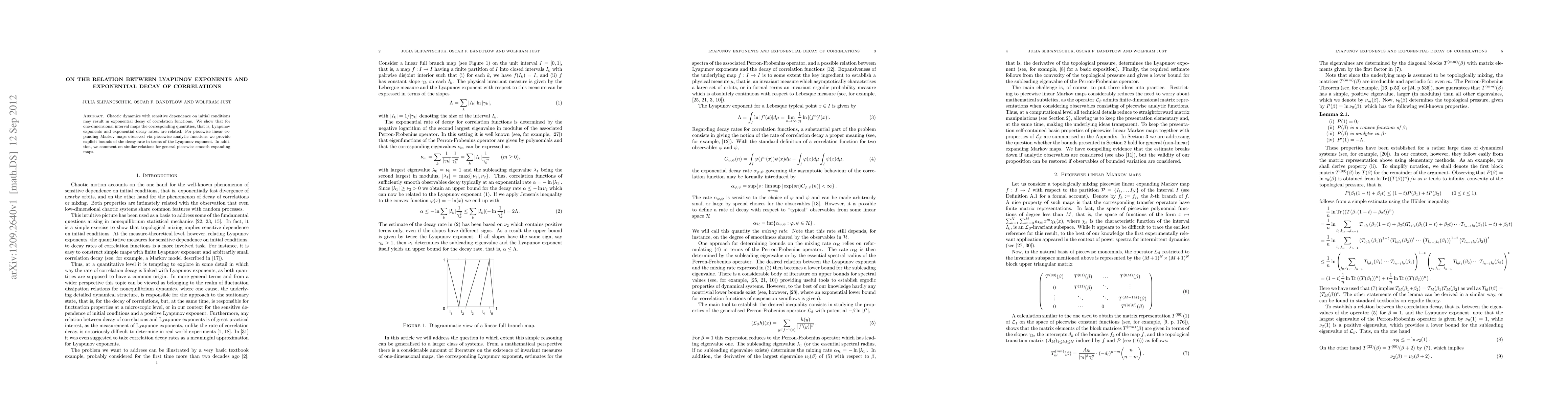 This paper establishes a connection between Lyapunov exponents and the exponential decay rate of correlation functions in chaotic dynamics, specifically for one-dimensional interval maps. It provides explicit bounds for piecewise linear expanding Markov maps and discusses similar relations for general piecewise smooth expanding maps.