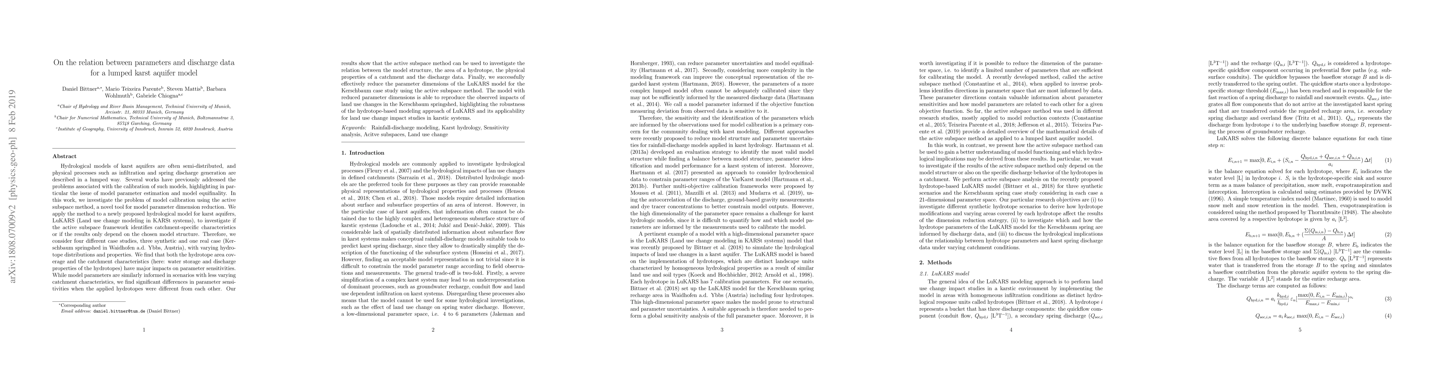 This paper investigates the calibration of a lumped karst aquifer model, LuKARS, using the active subspace method to reduce parameter dimensions. The study finds that hydrotope area and catchment characteristics significantly influence parameter sensitivities, demonstrating the method's effectiveness in identifying catchment-specific characteristics and reducing model complexity.
