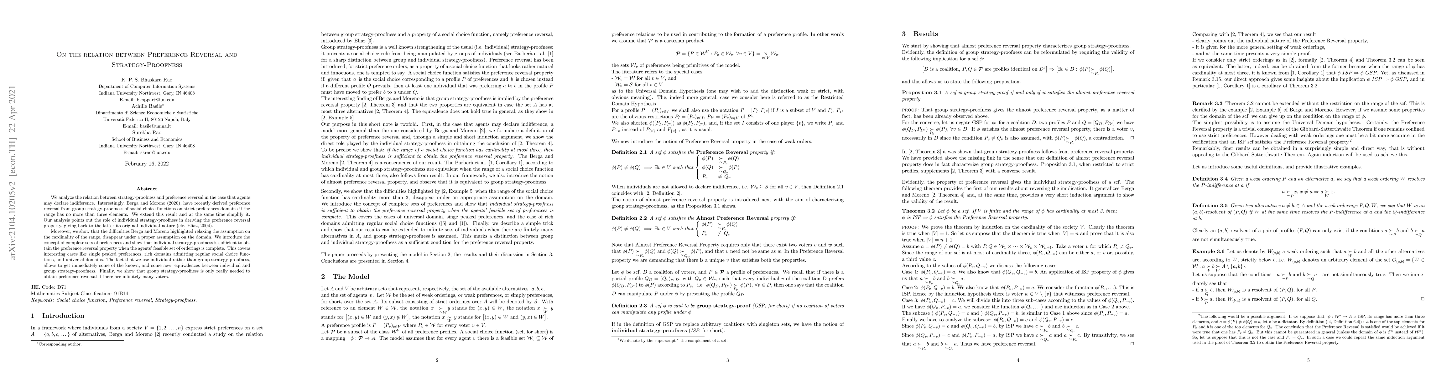 We analyze the relation between strategy-proofness and preference reversal in the case that agents may declare indifference. Interestingly, Berga and Moreno (2020), have recently derived preference reversal from group strategy-proofness of social choice functions on strict preferences domains if the range has no more than three elements. We extend this result and at the same time simplify it. Our analysis points out the role of individual strategy-proofness in deriving the preference reversal property, giving back to the latter its original individual nature (cfr. Eliaz, 2004). Moreover, we show that the difficulties Berga and Moreno highlighted relaxing the assumption on the cardinality of the range, disappear under a proper assumption on the domain. We introduce the concept of complete sets of preferences and show that individual strategy-proofness is sufficient to obtain the preference reversal property when the agents' feasible set of orderings is complete. This covers interesting cases like single peaked preferences, rich domains admitting regular social choice functions, and universal domains. The fact that we use individual rather than group strategy-proofness, allows to get immediately some of the known, and some new, equivalences between individual and group strategy-proofness. Finally, we show that group strategy-proofness is only really needed to obtain preference reversal if there are infinitely many voters.
