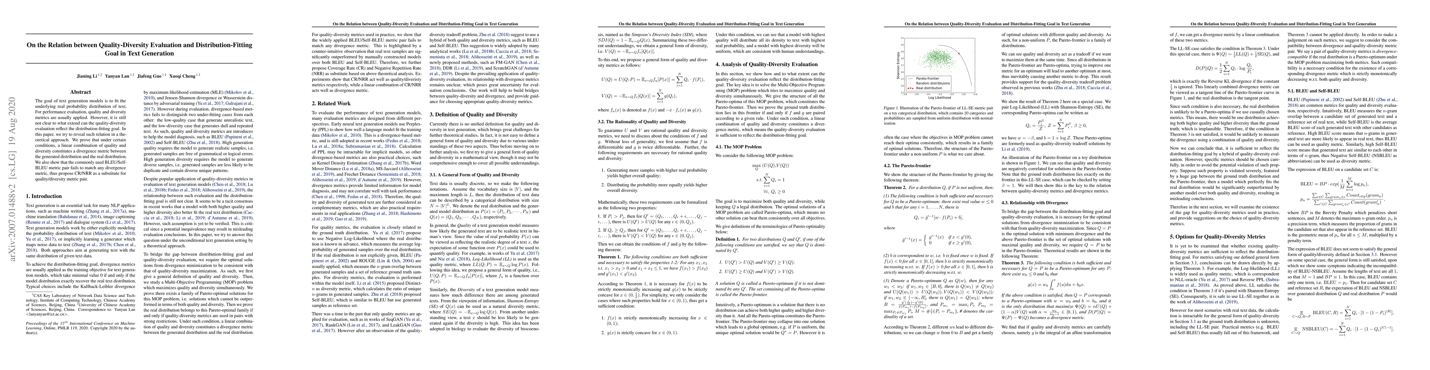 This paper explores the relationship between quality-diversity evaluation metrics in text generation models and their ability to reflect the distribution-fitting goal. It proposes a new metric pair, CR/NRR, as a substitute for BLEU/Self-BLEU.