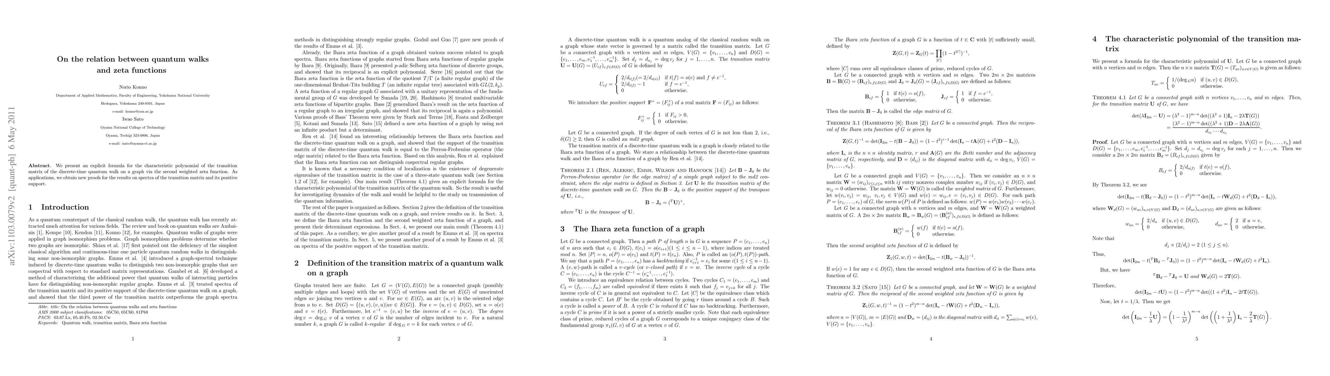 Summary: This paper establishes a connection between quantum walks on graphs and zeta functions, providing an explicit formula for the characteristic polynomial using the second weighted zeta function, and offering new proofs for the spectra of the transition matrix and its positive support.