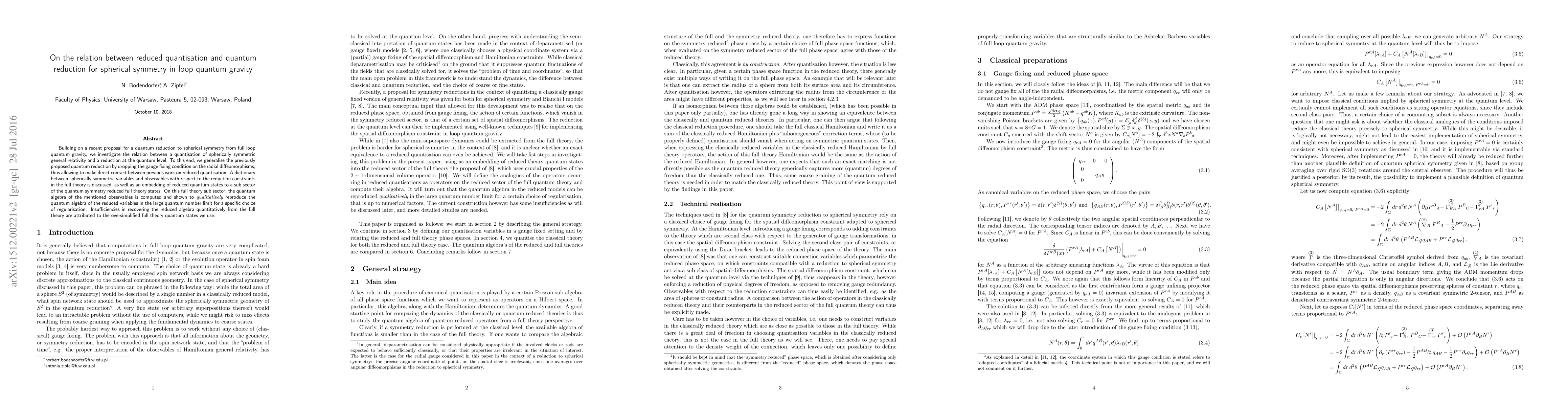 Building on a recent proposal for a quantum reduction to spherical symmetry from full loop quantum gravity, we investigate the relation between a quantisation of spherically symmetric general relativity and a reduction at the quantum level. To this end, we generalise the previously proposed quantum reduction by dropping the gauge fixing condition on the radial diffeomorphisms, thus allowing to make direct contact between previous work on reduced quantisation. A dictionary between spherically symmetric variables and observables with respect to the reduction constraints in the full theory is discussed, as well as an embedding of reduced quantum states to a sub sector of the quantum symmetry reduced full theory states. On this full theory sub sector, the quantum algebra of the mentioned observables is computed and shown to qualitatively reproduce the quantum algebra of the reduced variables in the large quantum number limit for a specific choice of regularisation. Insufficiencies in recovering the reduced algebra quantitatively from the full theory are attributed to the oversimplified full theory quantum states we use.