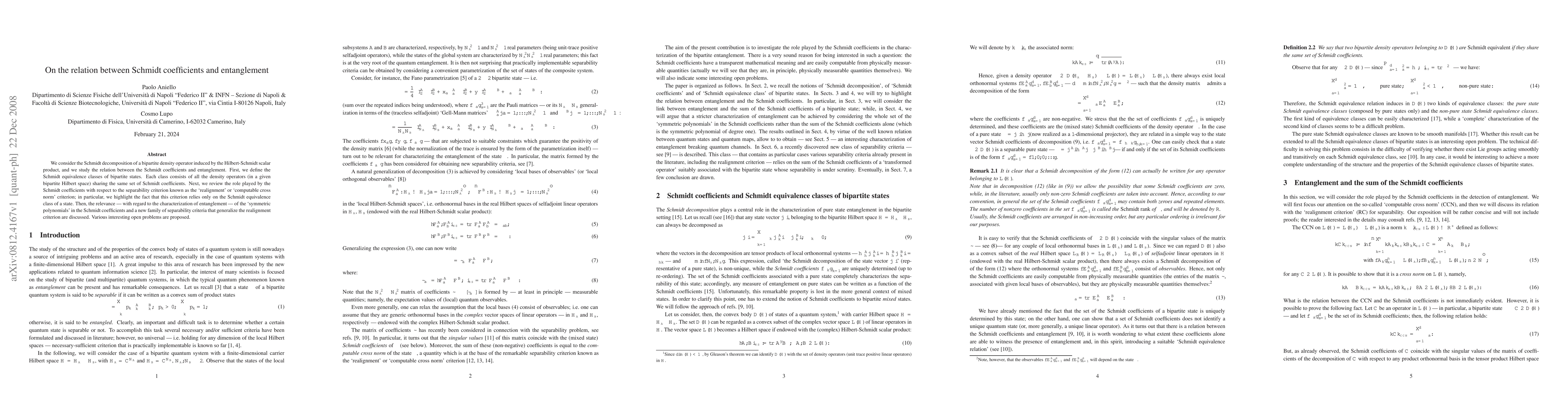 This paper explores the relationship between Schmidt coefficients and entanglement in bipartite quantum states, defining Schmidt equivalence classes and discussing how these coefficients relate to the realignment separability criterion. It also examines symmetric polynomials in Schmidt coefficients and introduces new separability criteria, proposing several open problems for future research.