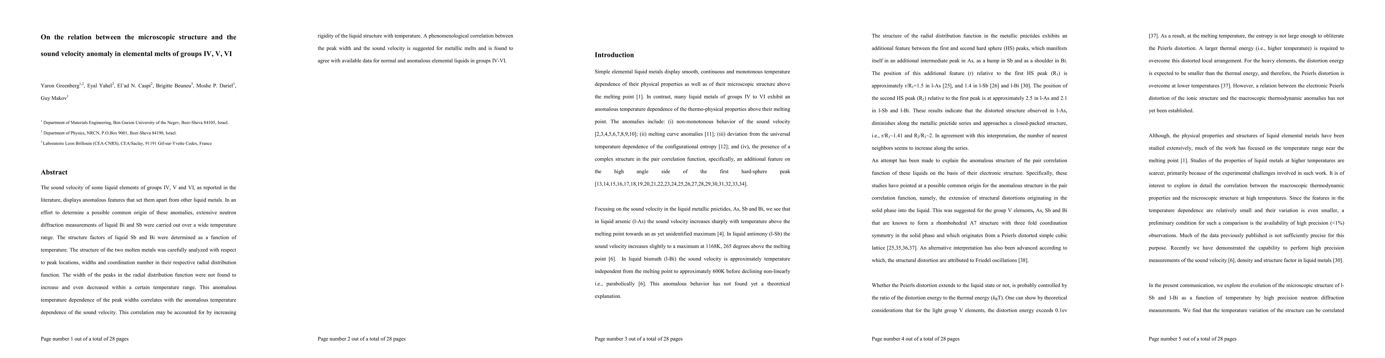 This study investigates the relationship between the microscopic structure and sound velocity anomalies in elemental melts of groups IV, V, and VI. Neutron diffraction measurements reveal that the peak widths in the radial distribution function of liquid Bi and Sb decrease with temperature, correlating with the anomalous temperature dependence of sound velocity, suggesting increased rigidity in the liquid structure.
